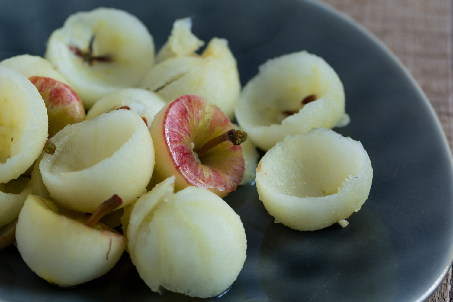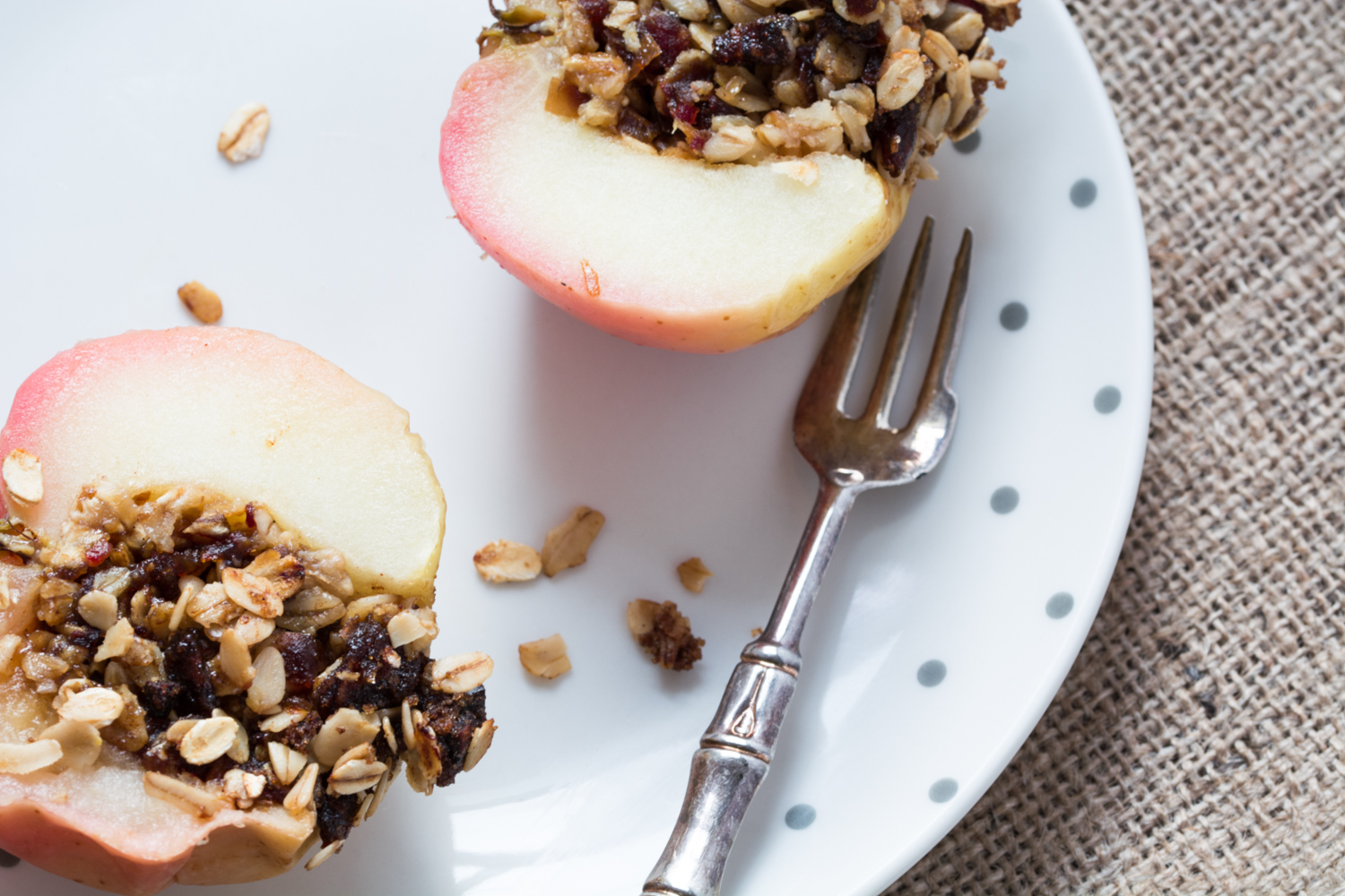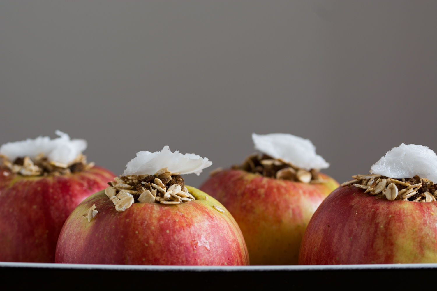 M-am trezit azi dimineață cu un dor nebun de mere coapte, așa că am luat frumușel niște mere roșii dulci-acrișoare (mere locale, cum altfel), le-am scobit cu ajutorul unei noisette, lucru pe care-l puteam executa la fel de bine și cu un cuțit de legume și le-am umplut cu un amestec caramelos și vanilat de fulgi de ovăz, curmale și zahăr brun. Le-am garnisit cu câte o bucățică de ulei de cocos în stare solidă (și untul nostru clasic ar fi funcționat la fel de bine) și le-am lăsat să se împrieteneacă la cuptor, timp de vreo jumătate bună de ceas. A rezultat o minune de desert!