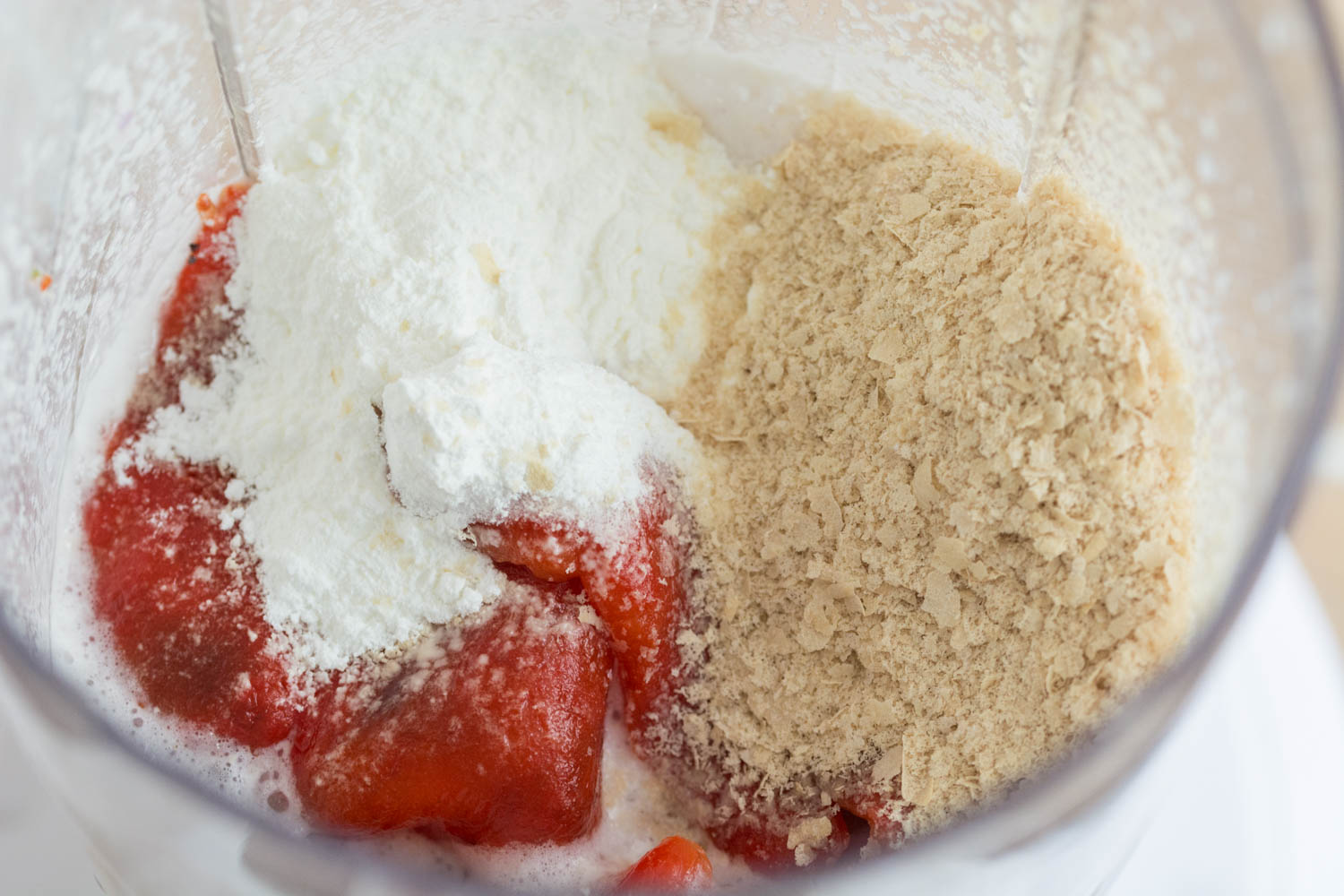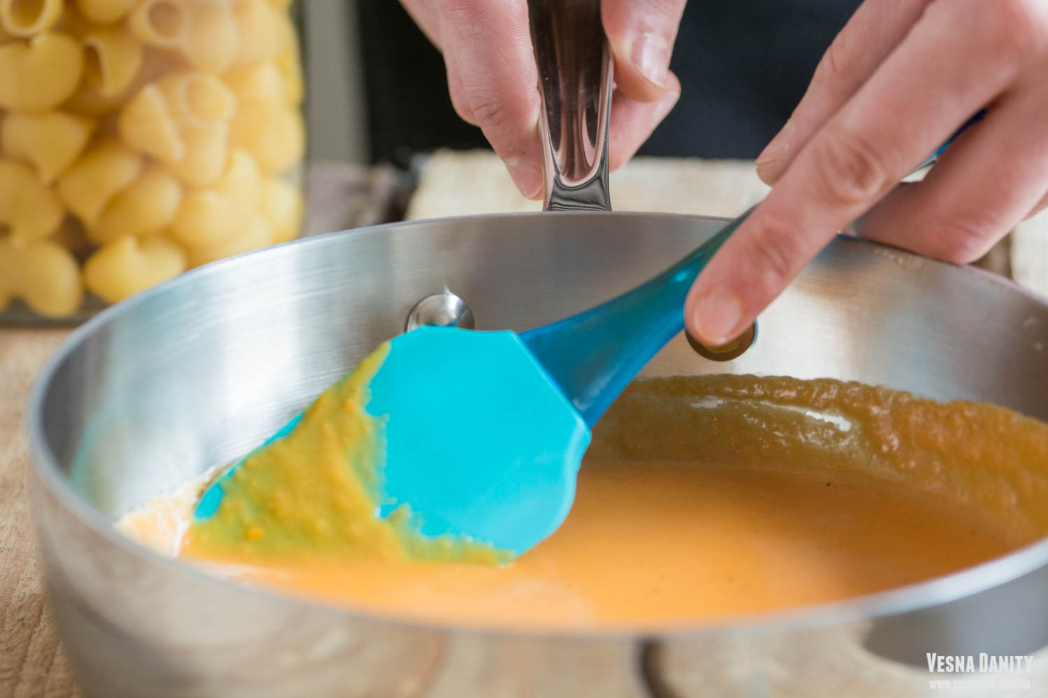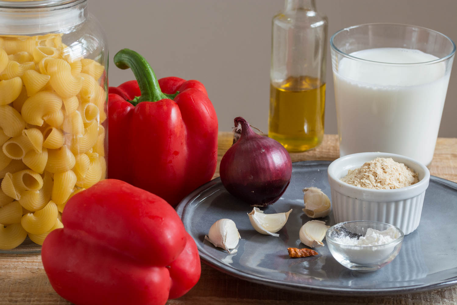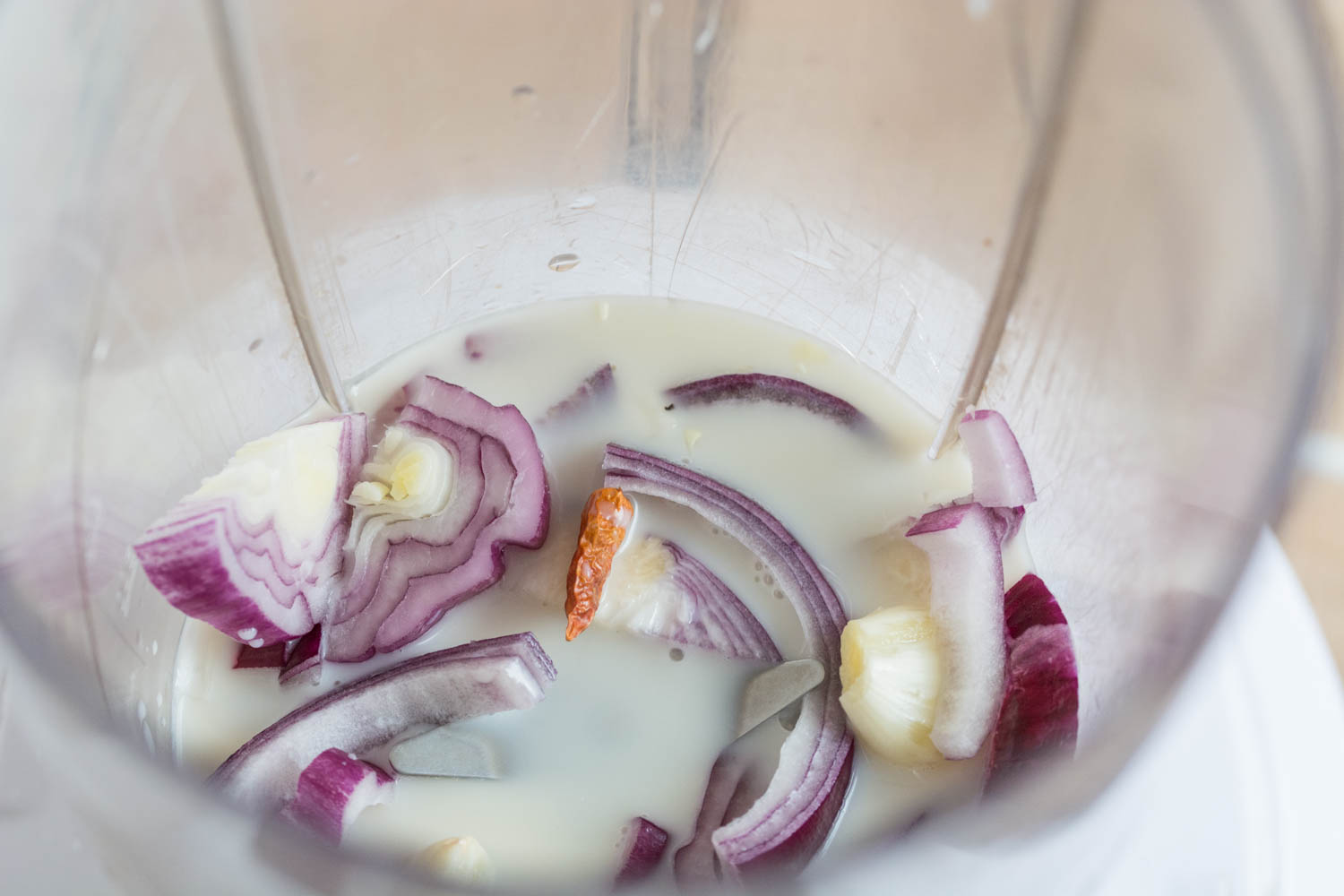 5. Prepararea sosului. În vasul unui blender am mixat laptele împreună cu ceapa, usturoiul și ardeiul iute. Am adăugat ardeii copți, uleiul de măsline, amidonul și fulgii de drojdie inactivă.