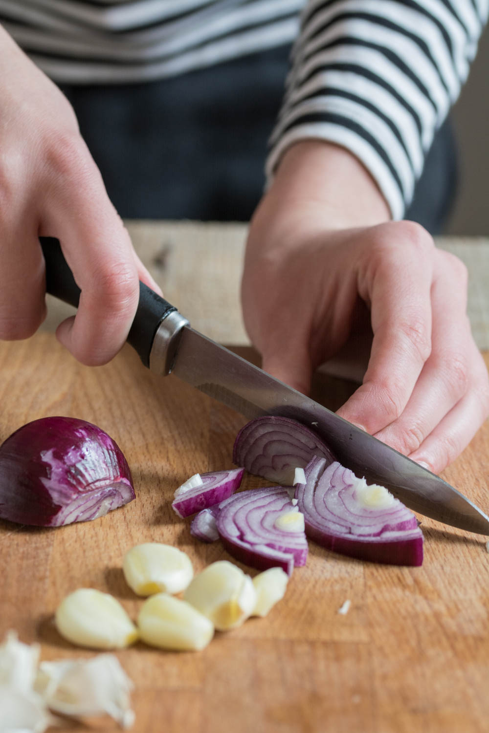 4. Ceapa și usturoiul. Am decojit ceapa și am tăiat-o rondele. Am decojit usturoiul.