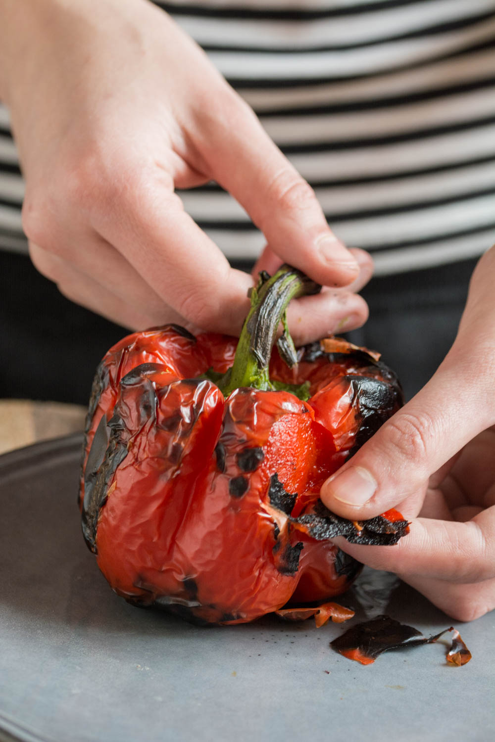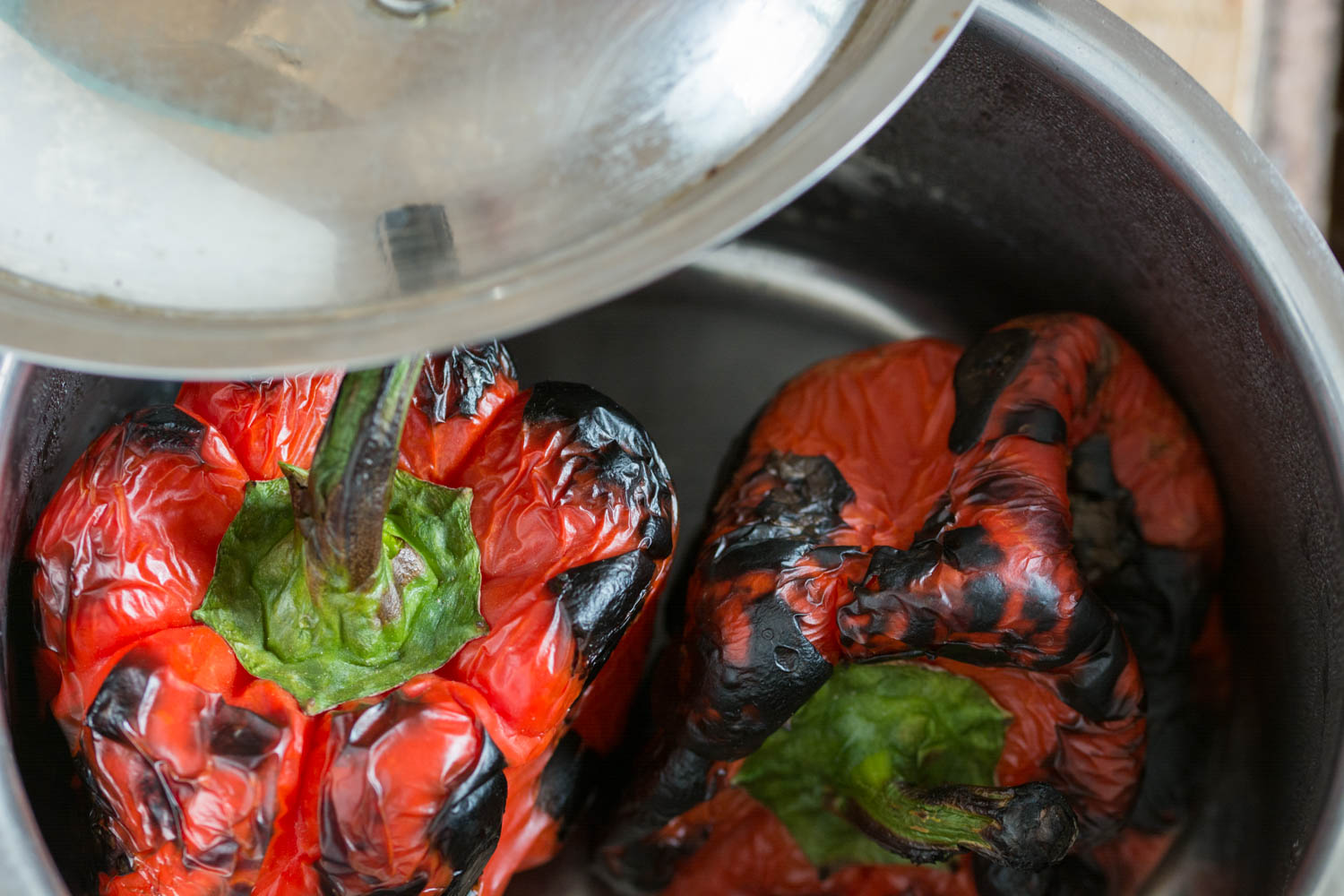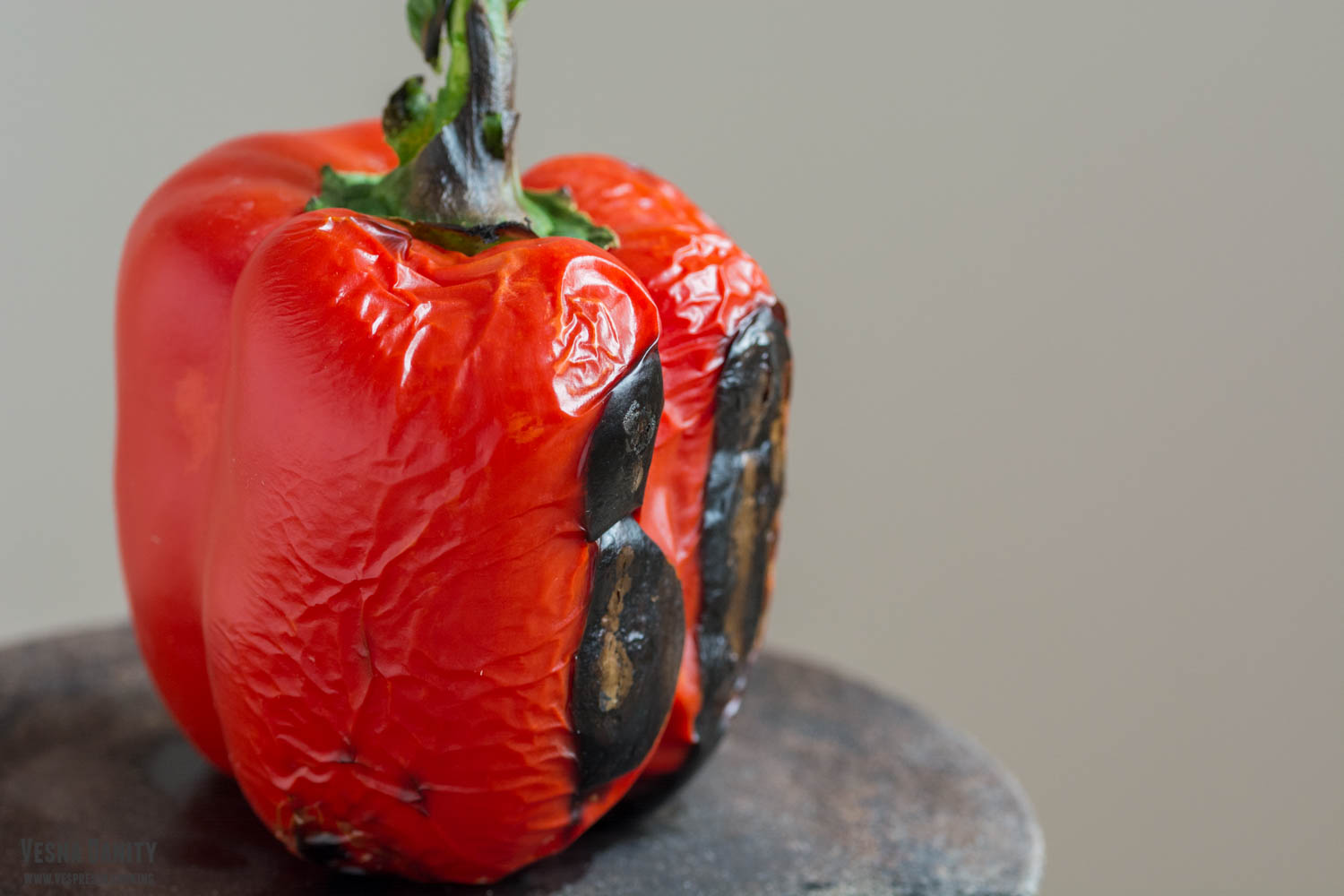 1. Ardeiul gras. Am lust un disc de metal și l-am așezat pe ochiul cel mare aragazului. Am așezat ardeiul și l-am copt pe toate părțile, având grijă să îl înnegresc uniform. L-am așezat într-o oală mică de sosuri și l-am acoperit cu un capac pentru a face condens (în felul acesta fiindu-mi mult mai ușor să-l curăț). După 10 minute am decojit ardeiul, i-am înlăturat cotorul și semințele, l-am clătit și l-am uscat cu un prosop de hârtie, după care l-am tăiat în fâsii late de 1 deget.