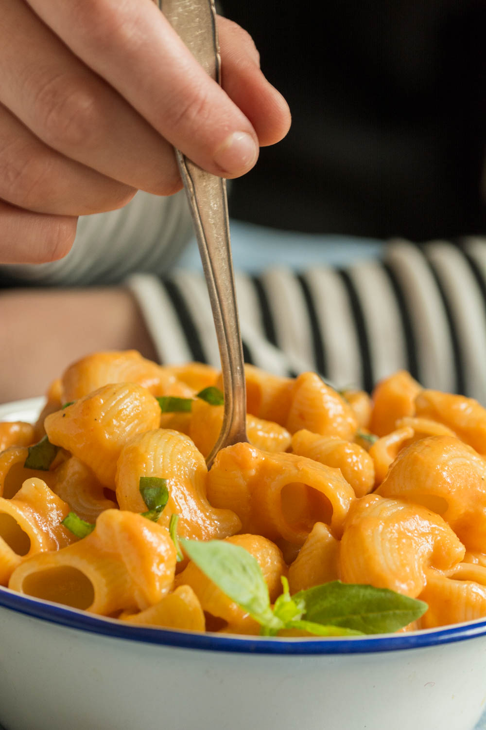 7. Asamblare & servire. Am turnat sosul peste pastele fierte și scurse, după care am amestecat energic. Am servit pastele cu sos de ardei copt în boluri; am presărat fulgi de drojdie inactivă și panglici de busuioc.