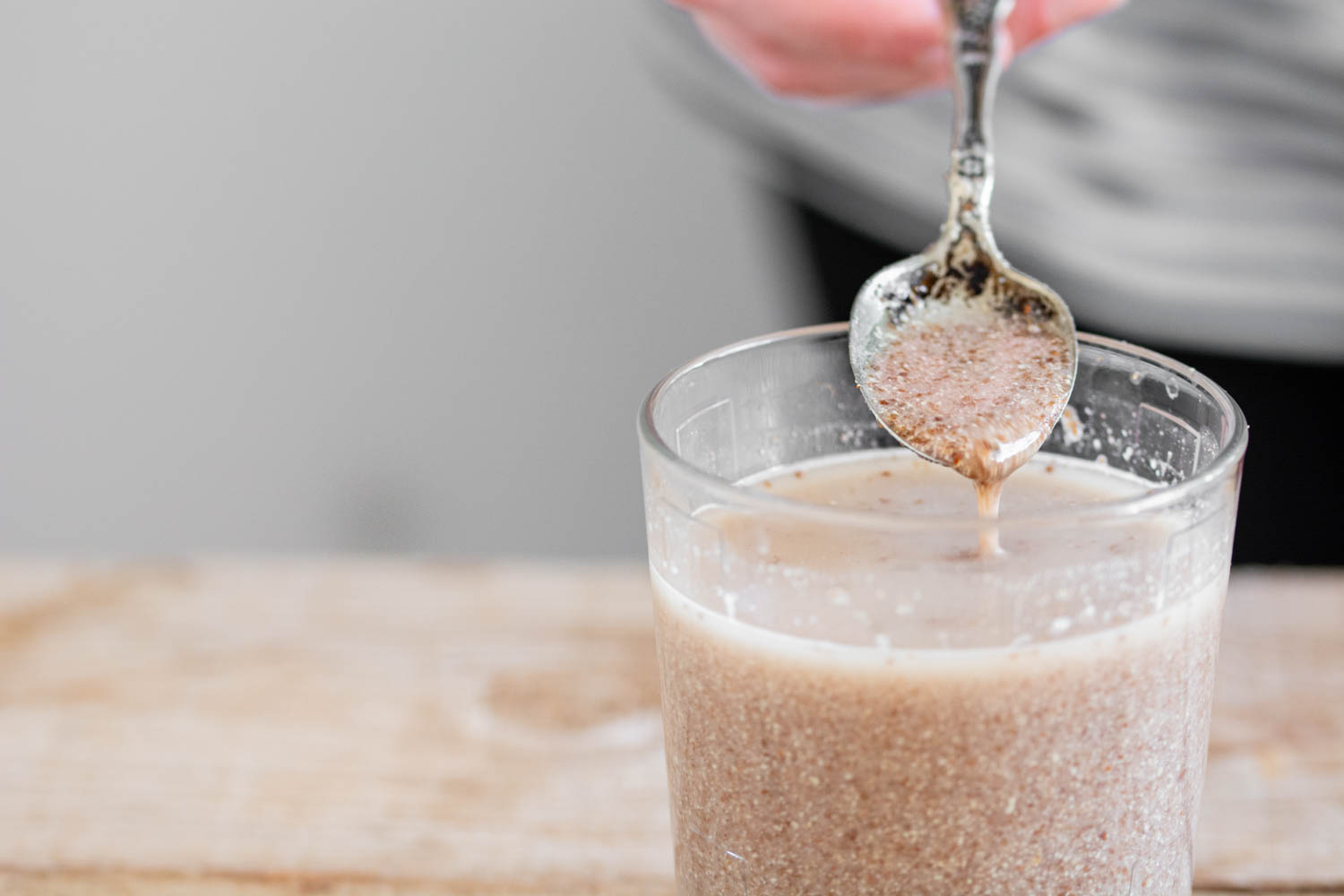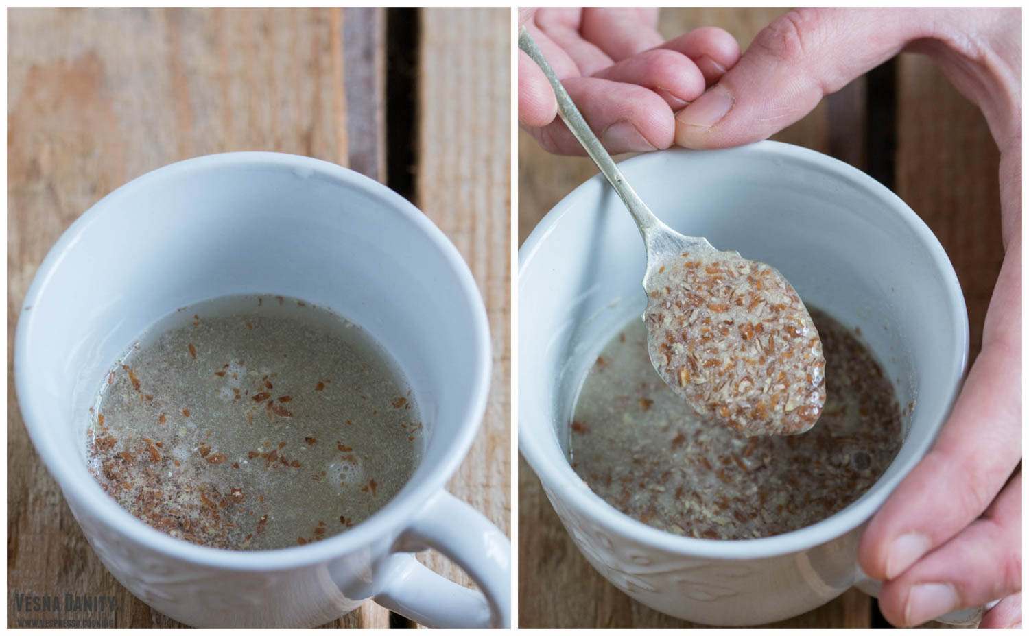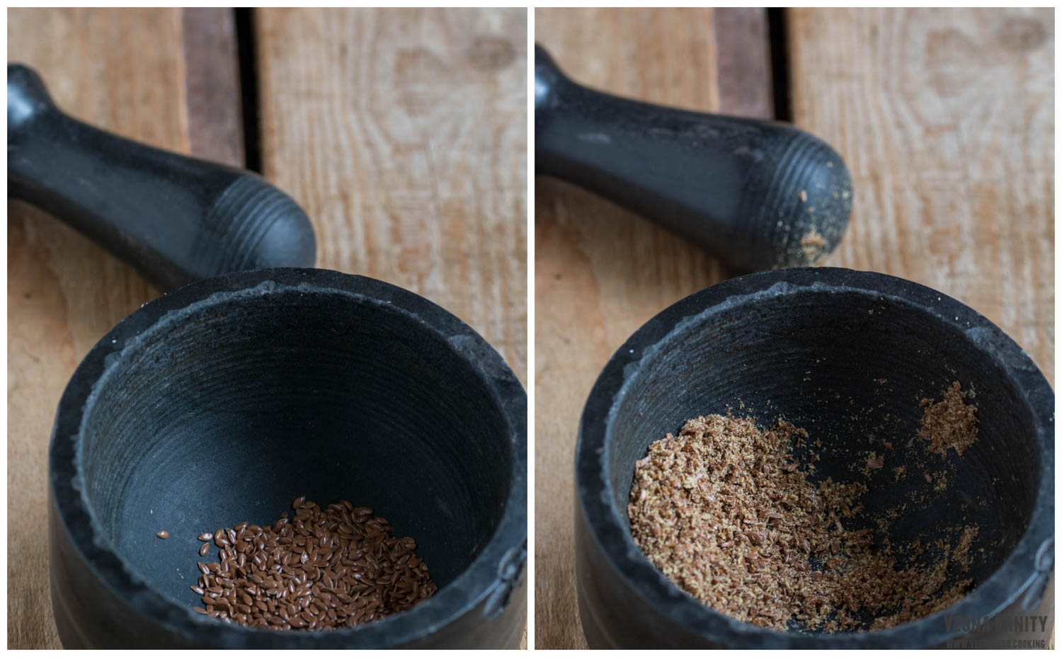 1. Prepararea înlocuitorului de ou. Am așezat 1 lingură de semințe de in în mojar și le-am sfărâmat energic cu ajutorul unui pistil. Am așezat pudra astfel obținută într-o ceașcă și am acoperit-o cu 3 linguri de apă. Am lăsat amestecul deoparte timp de 5 minute. După ce s-au scurs cele 5 minute, am observat că amestecul devenise gelatinos.