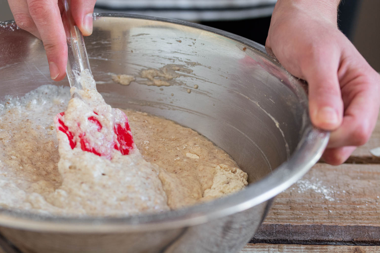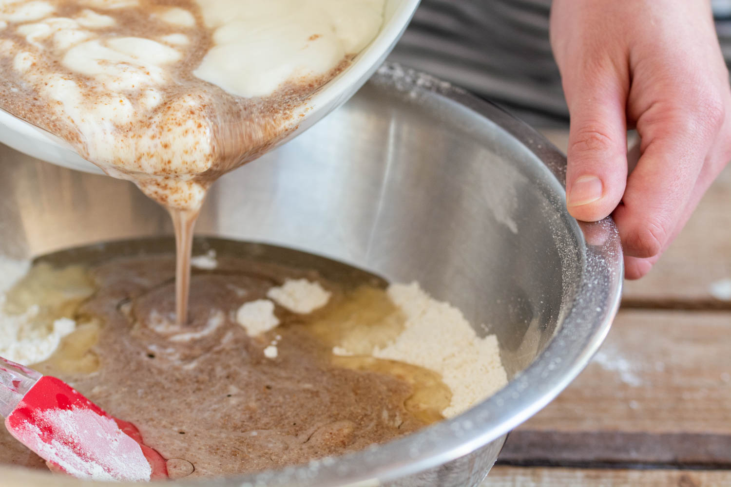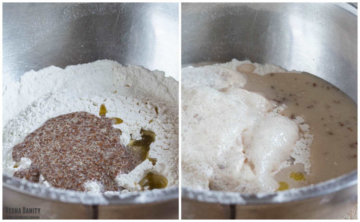3. Cernerea făinii. Într-un bol încăpător am cernut făina. Am făcut o adâncitură în mijlocul făinii și am adăugat lichidul din bol (apa + lapte + zahărul + drojdia). Am adăugat uleiul și semințele de in hidratate și am amestecat cu o furculiță.