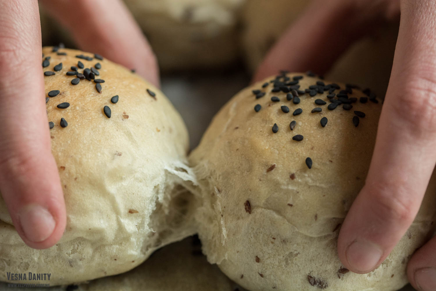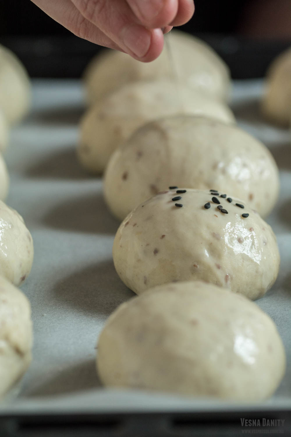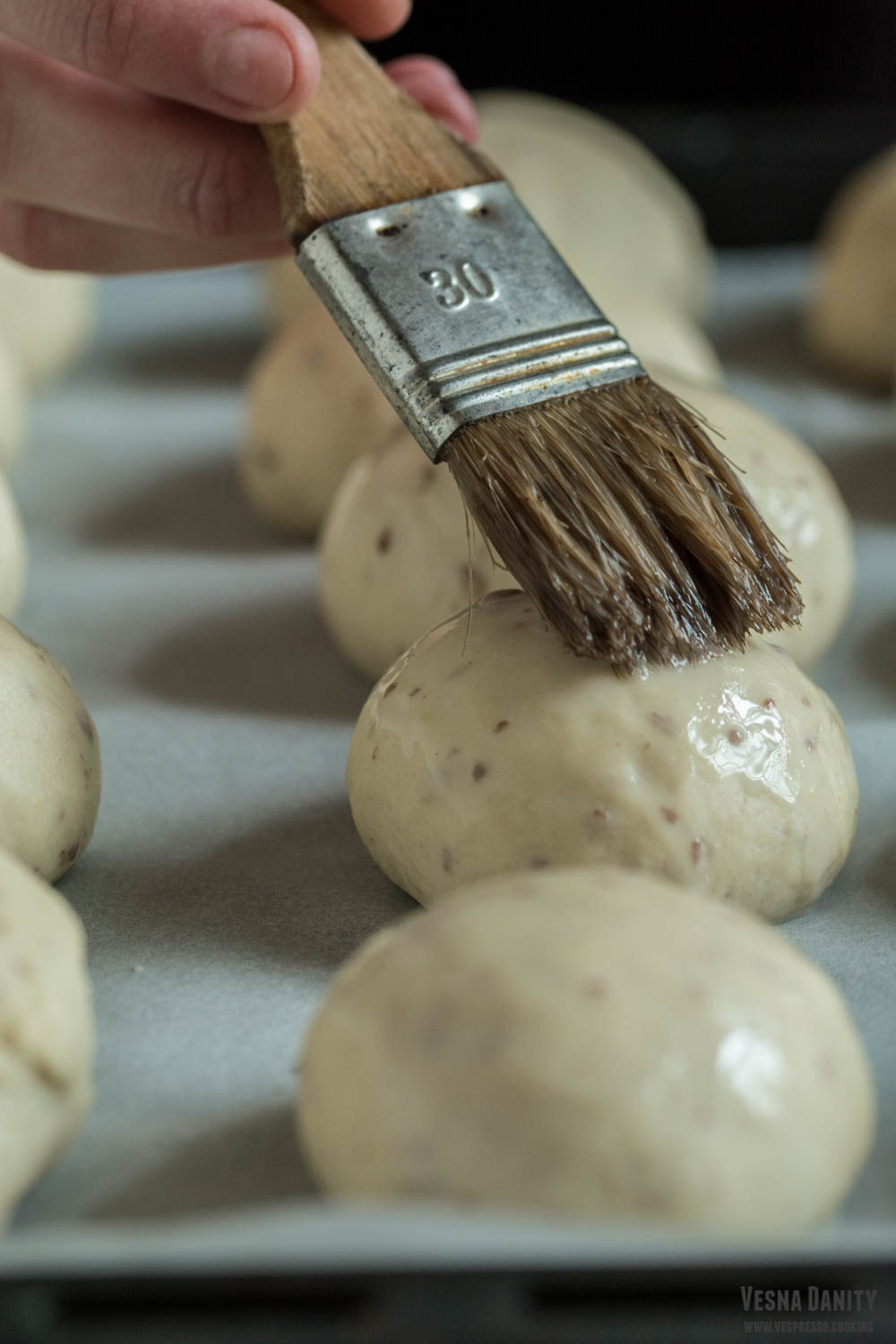9. Decor. Am amestecat cele 2 linguri de lapte cu zahărul rămas și am încălzit amestecul. Am uns fiecare chiflă cu lichidul călduț, după care am decorat fiecare chiflă cu semințe de susan negru.