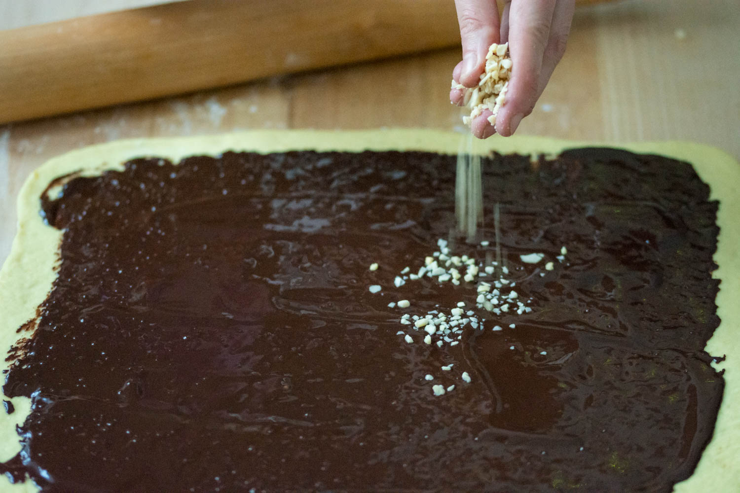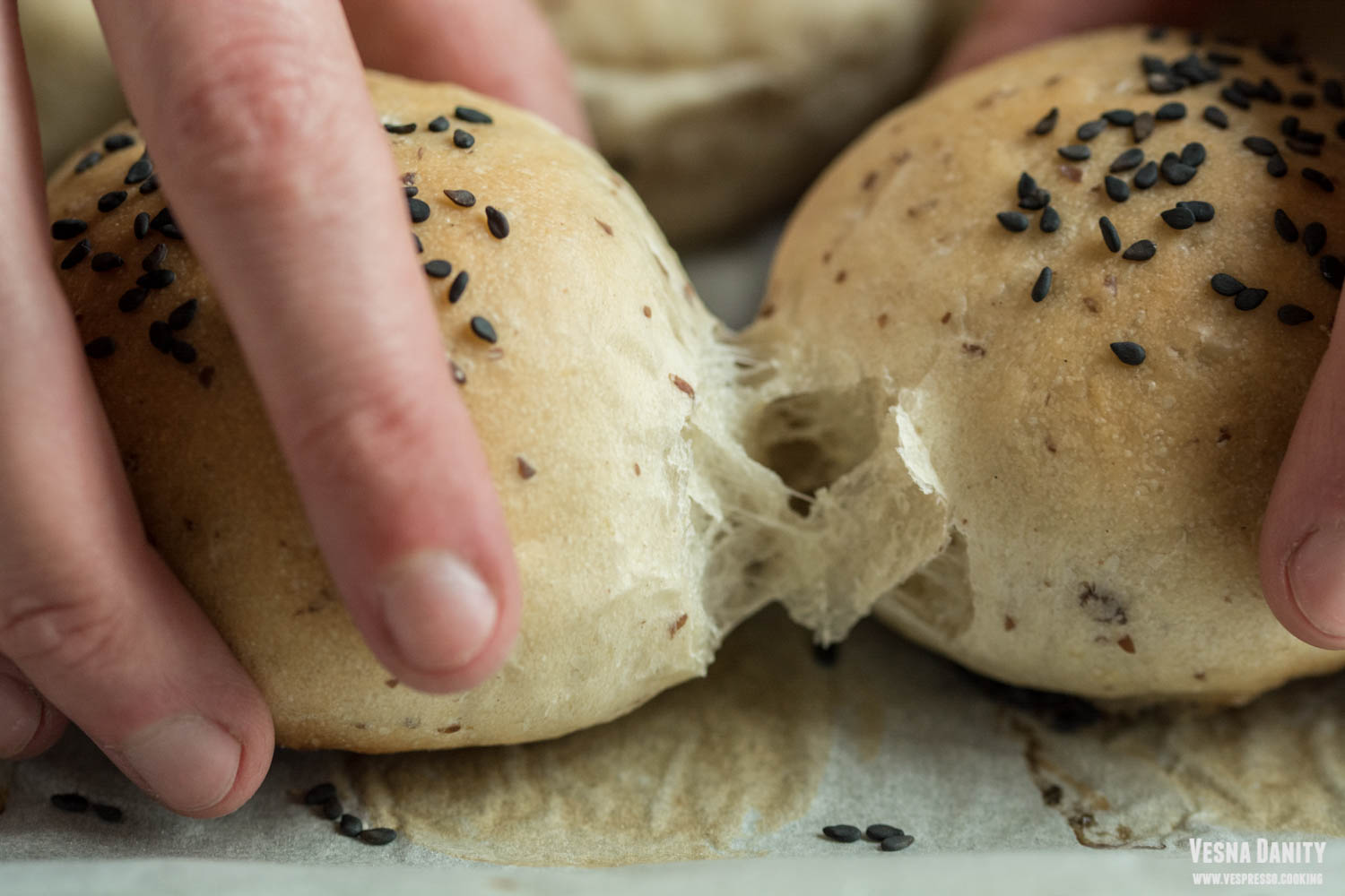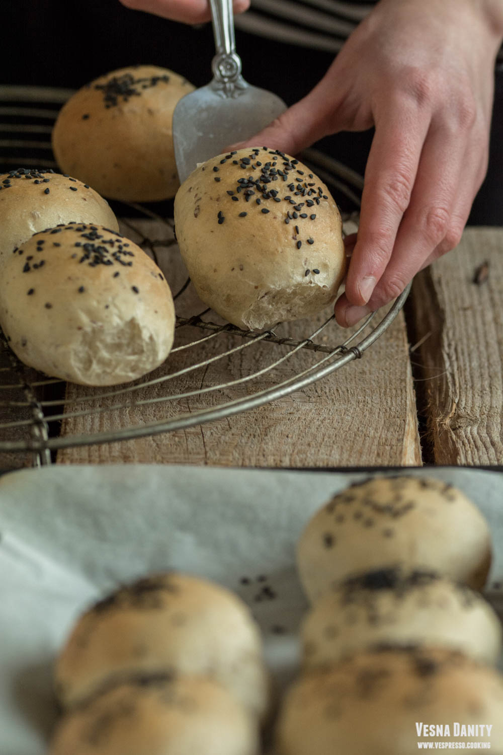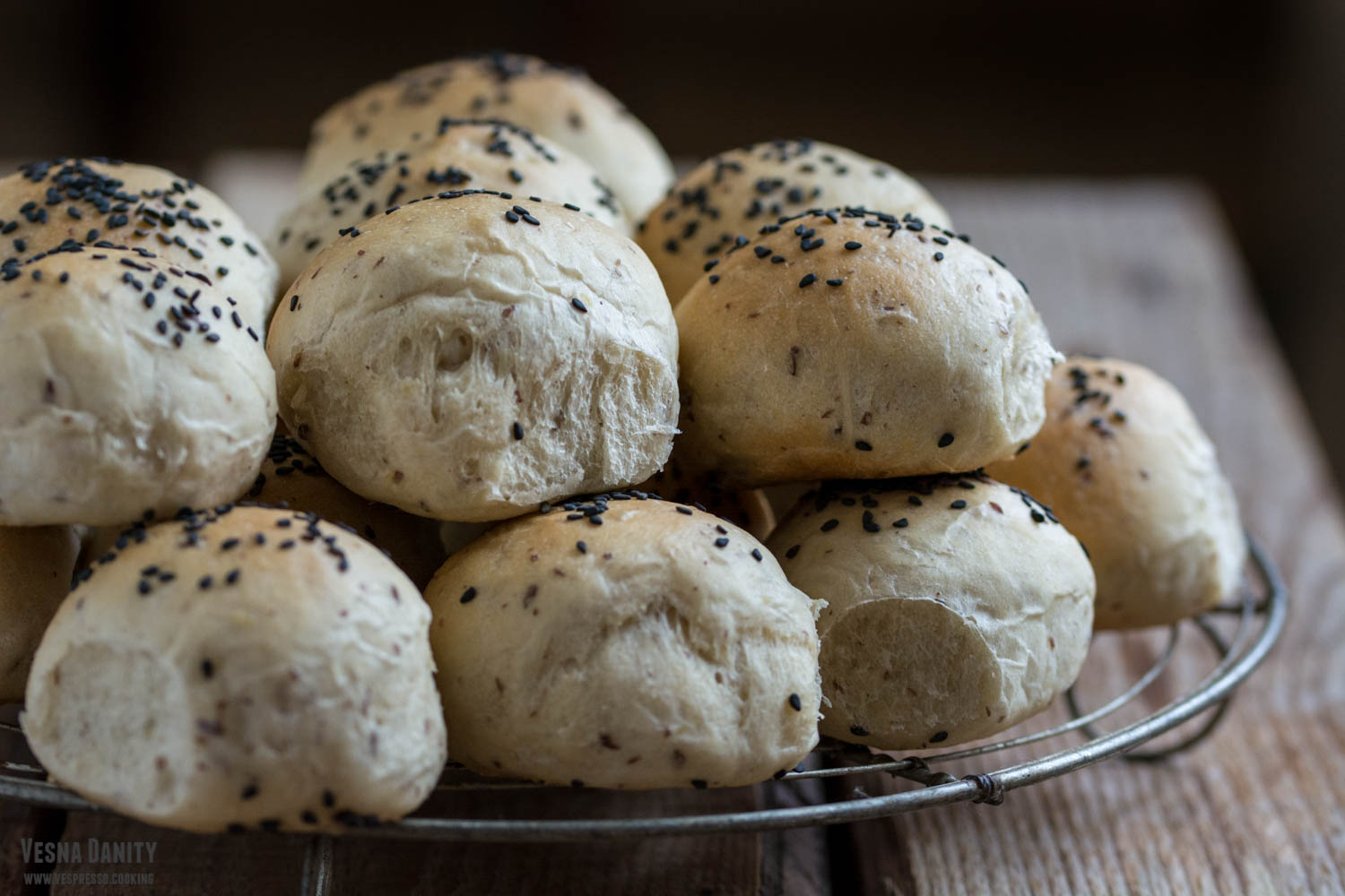 9. Decor. Am amestecat cele 2 linguri de lapte cu zahărul rămas și am încălzit amestecul. Am uns fiecare chiflă cu lichidul călduț, după care am decorat fiecare chiflă cu semințe de susan negru.
