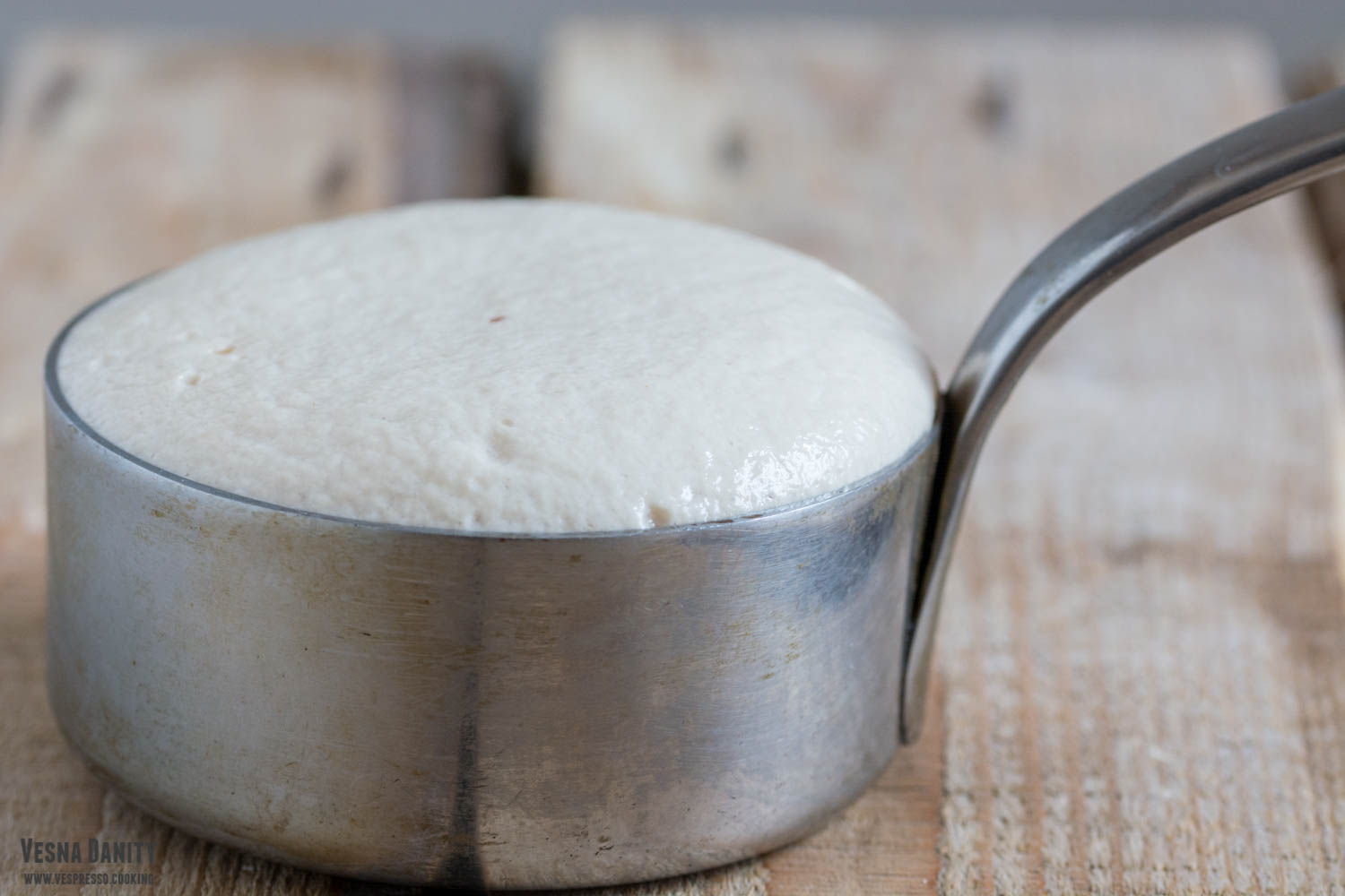 2. Activarea drojdiei. Într-o cratiță mica am încălzit apa și laptele de migdale până au ajuns la 36 – 38°C. Am adăugat zahărul și drojdia și am lăsat oala deoparte pentru 5 minute. După cele 5 minute, drojdia se activase și amestecul era foarte spumos la suprafață.