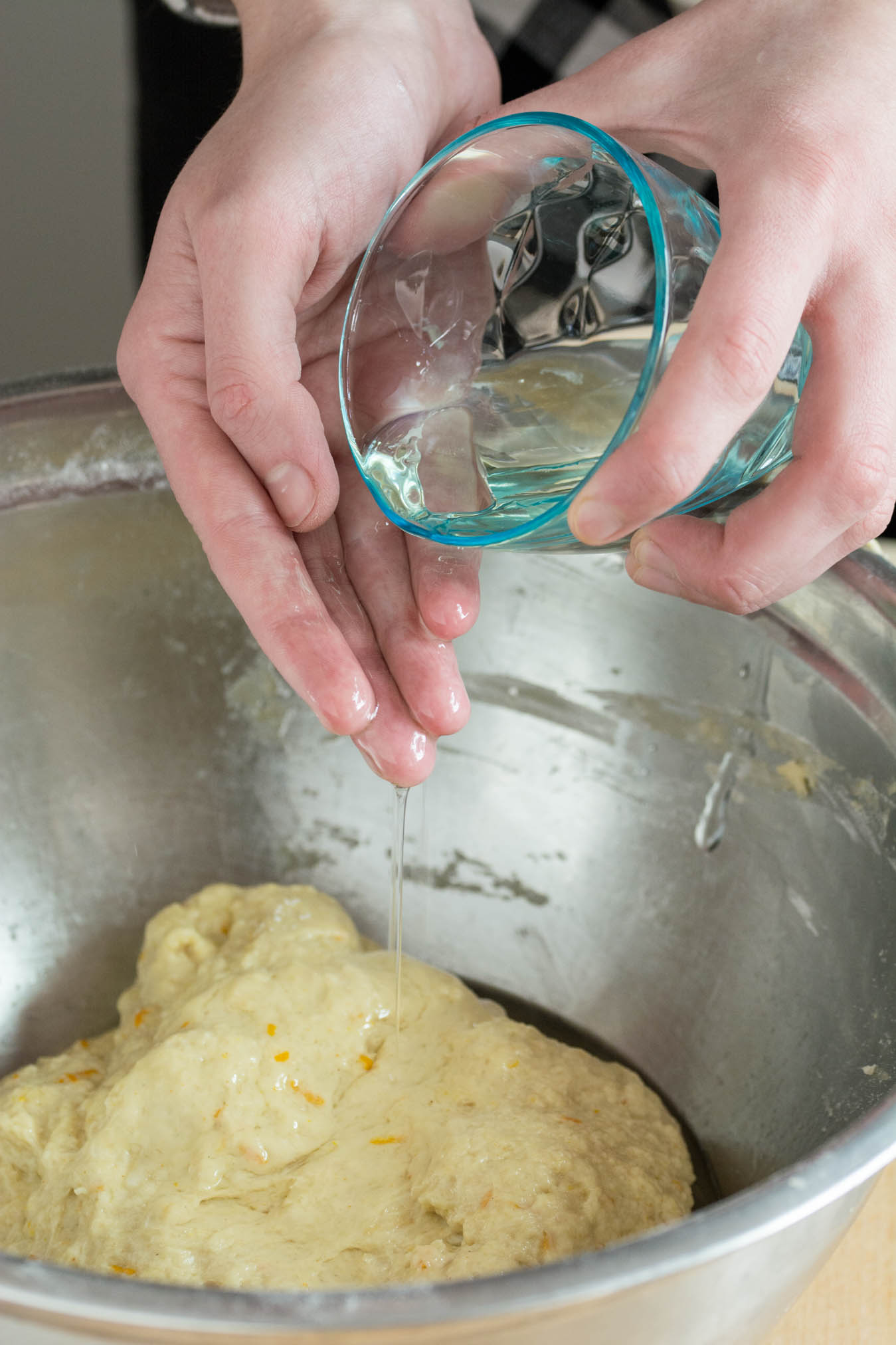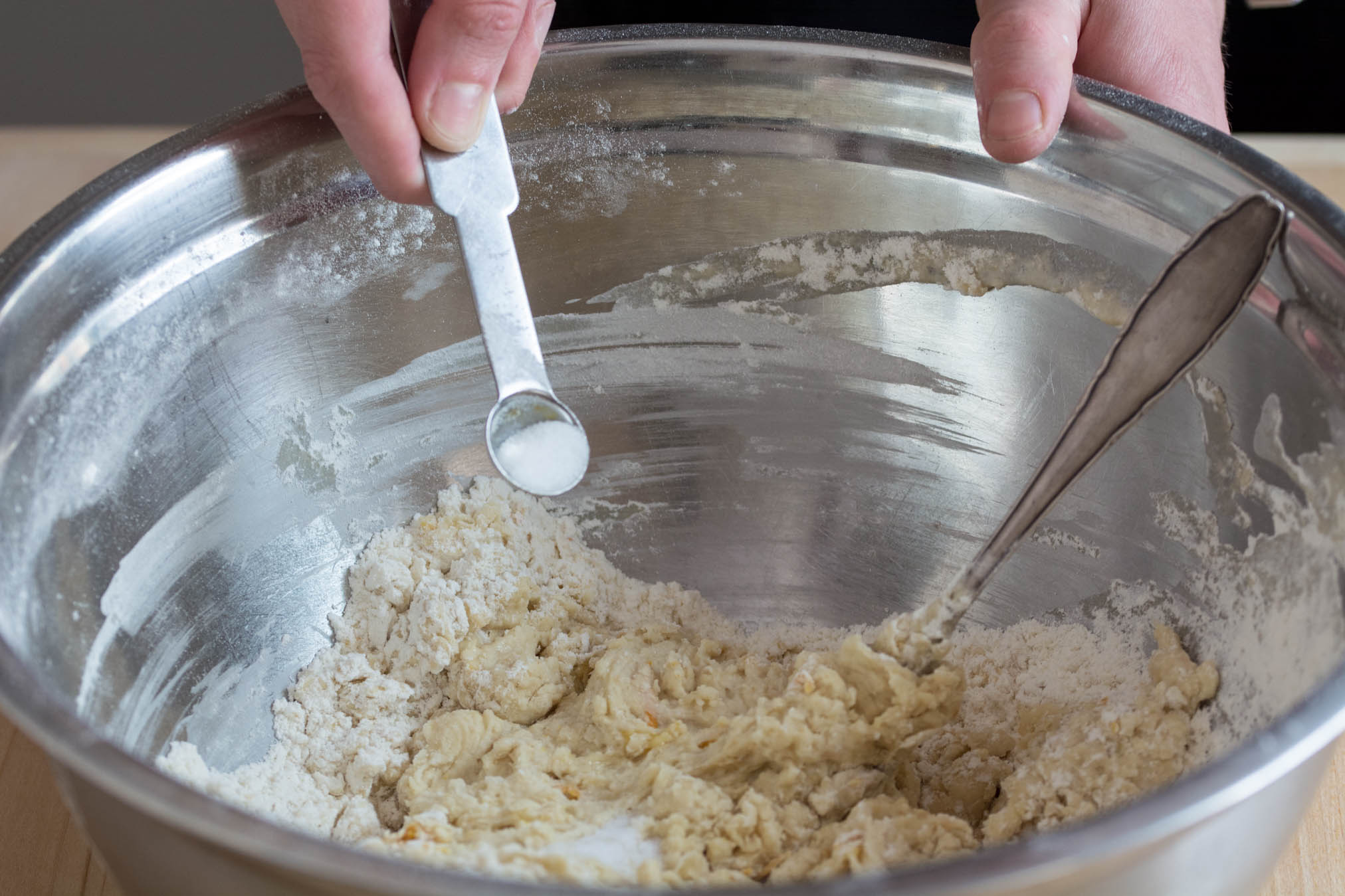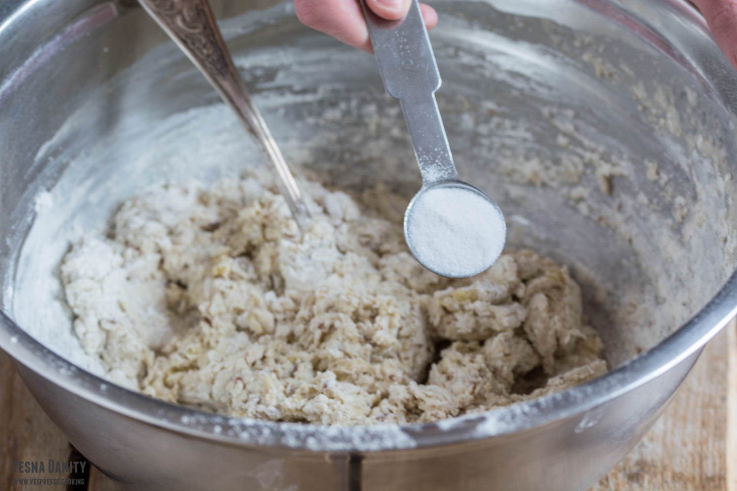 4. Sarea. În acest moment am adăugat sarea, după care am continuat să amestec cu mâinie până am format o bilă lipicioasă de aluat. Ultimul ingredient pe care îl adaug unui aluat este sarea. Daca e adaugată la început, aceasta interferează cu drojdia iar aluatul nu va crește la fel de bine.