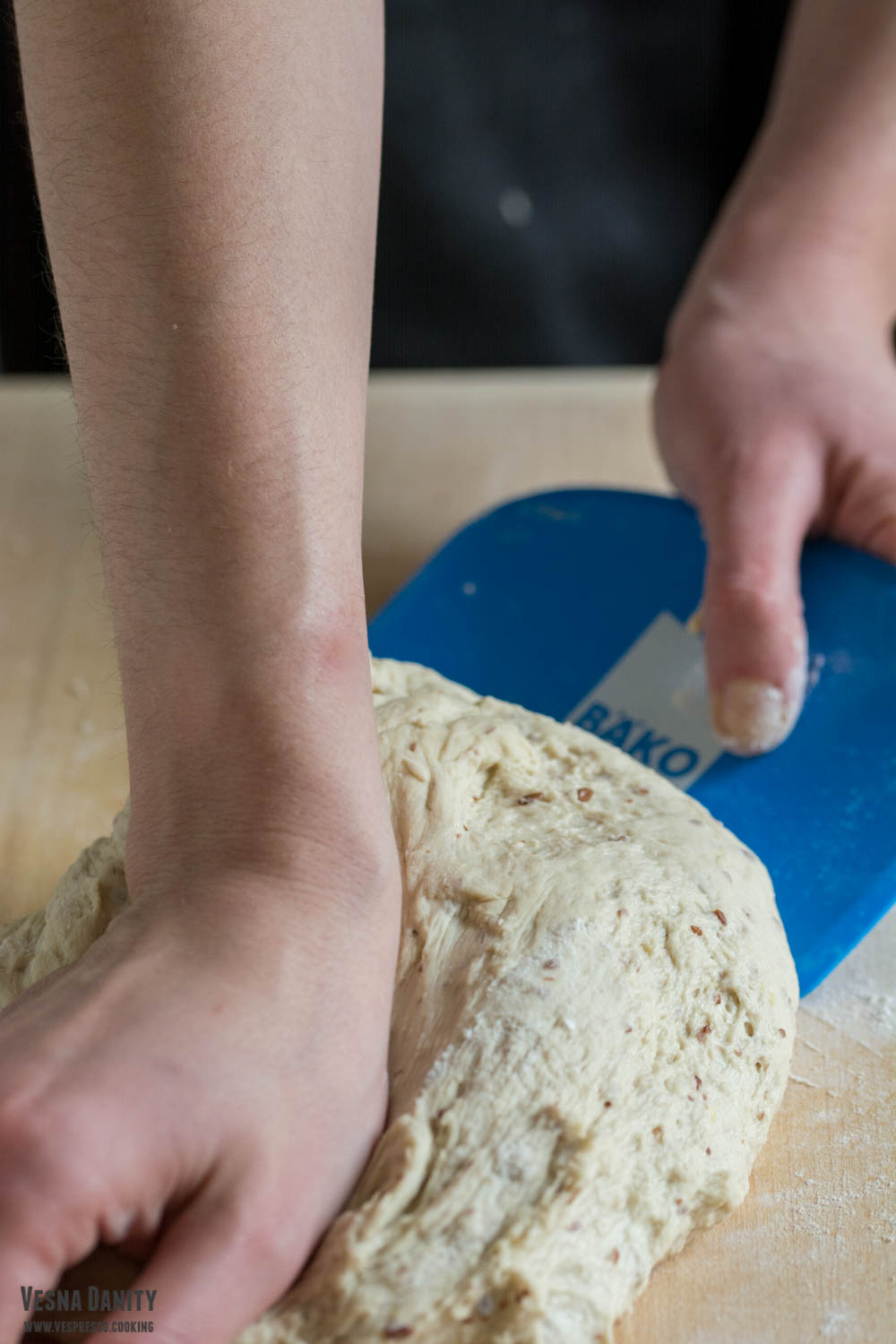 5. Frământare. Am mutat aluatul lipicios pe blatul de lucru pudrat cu 1/2 de lingură de făină și am început să-l frământ energic. Aluatul se lipea de blatul de lucru, așa că m-am folosit de o racletă pentru aluat pentru a-l dezlipi. De fiecare dată când mi se părea că aluatul se lipește prea tare de mâini, îl pudram cu făina rămasă. Am continuat să îl frământ până când a devenit suplu și elastic.
