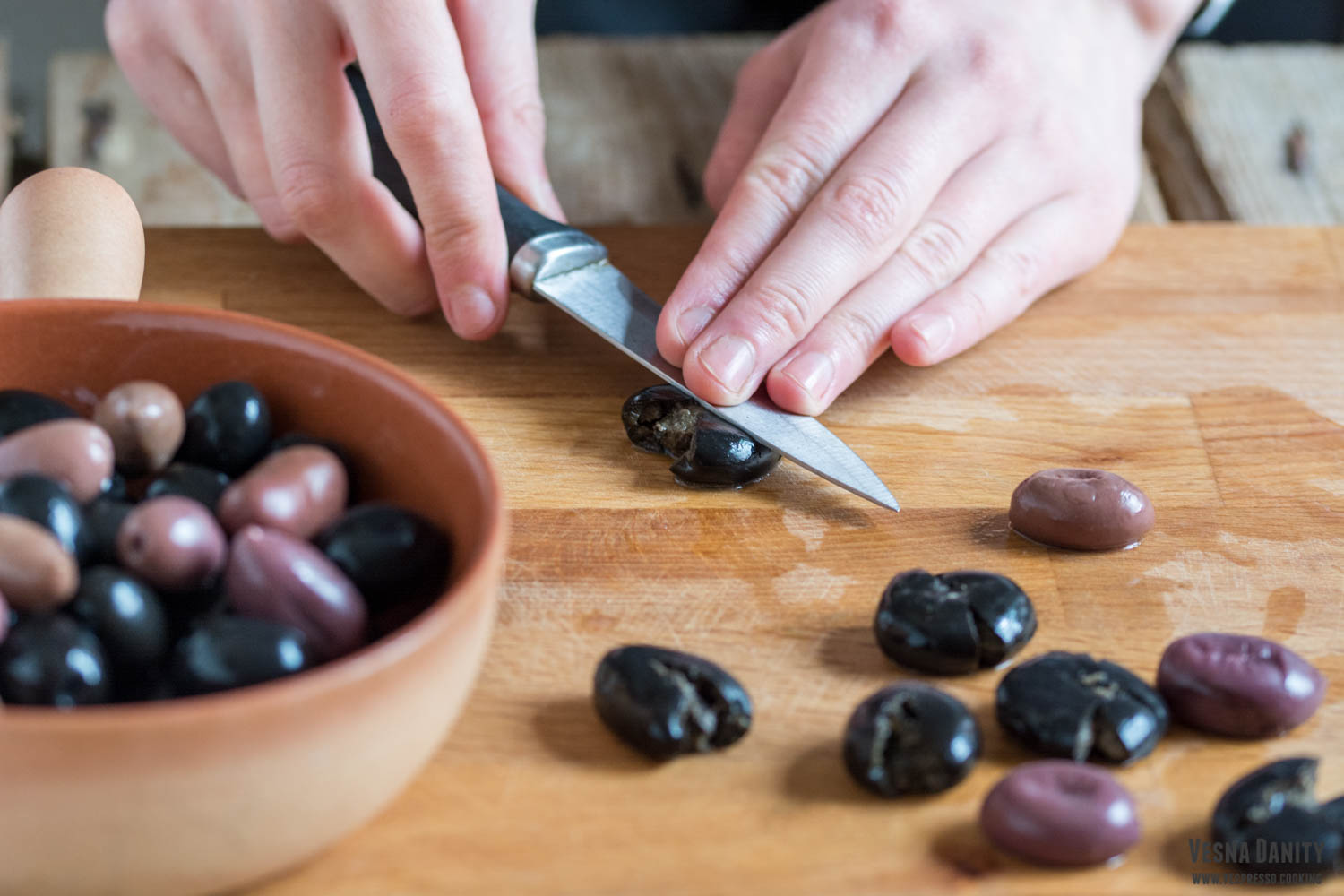1. Îndepărtarea sâmburilor. Pentru acest pas mă folosesc de un fund de lemn și de un cuțit. Iau fiecare măslină și o apăs cu latul cuțitului pentru a o turti. După ce presez toate măslinele, le îndepărtez fiecăreia sâmburele cu ajutorul degetelor.