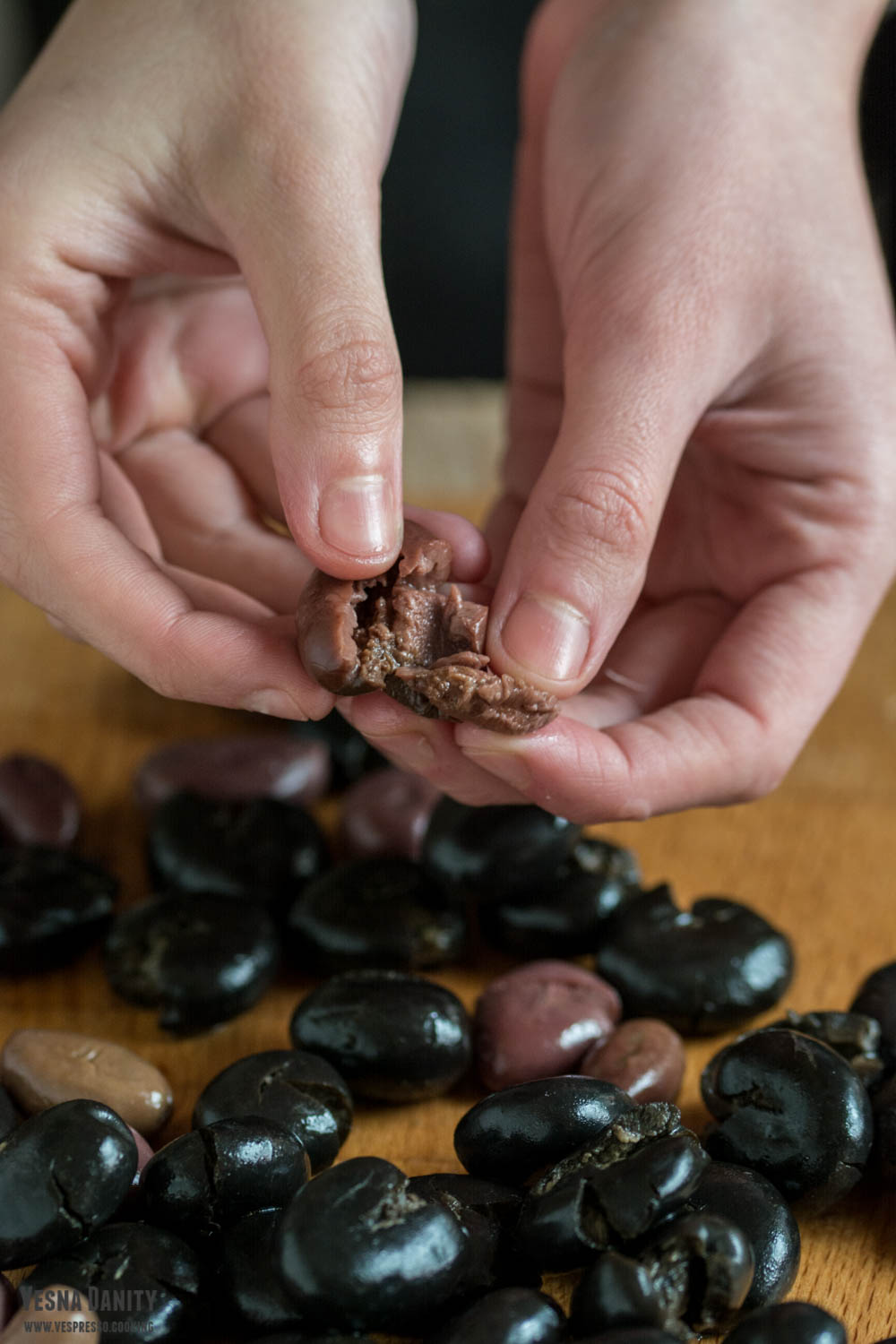 2. Hummus. Am strecurat boabele de năut cu ajutorul unei strecurătoare, după care le-am clătit sub jetul de apă. Am luat câte 8 – 10 boabe și le-am frecat între palme pentru a le înlătura cojile – pasul acesta este opțional, dar contribuie la obținerea unui hummus mai cremos.