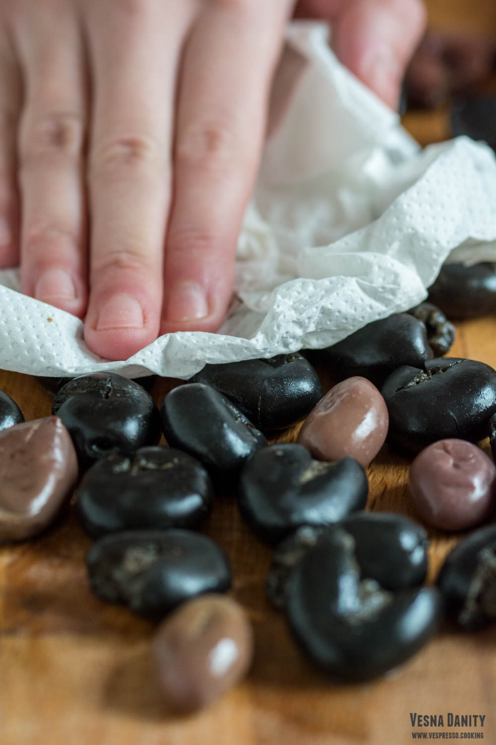 2. Zvântarea măslinelor. Așez bucățile de măsline pe un șervet de bucătărie și le acopăr cu un alt prosop de hârtie. Le presez ușor cu degetele pentru a elimina excesul de lichid.
