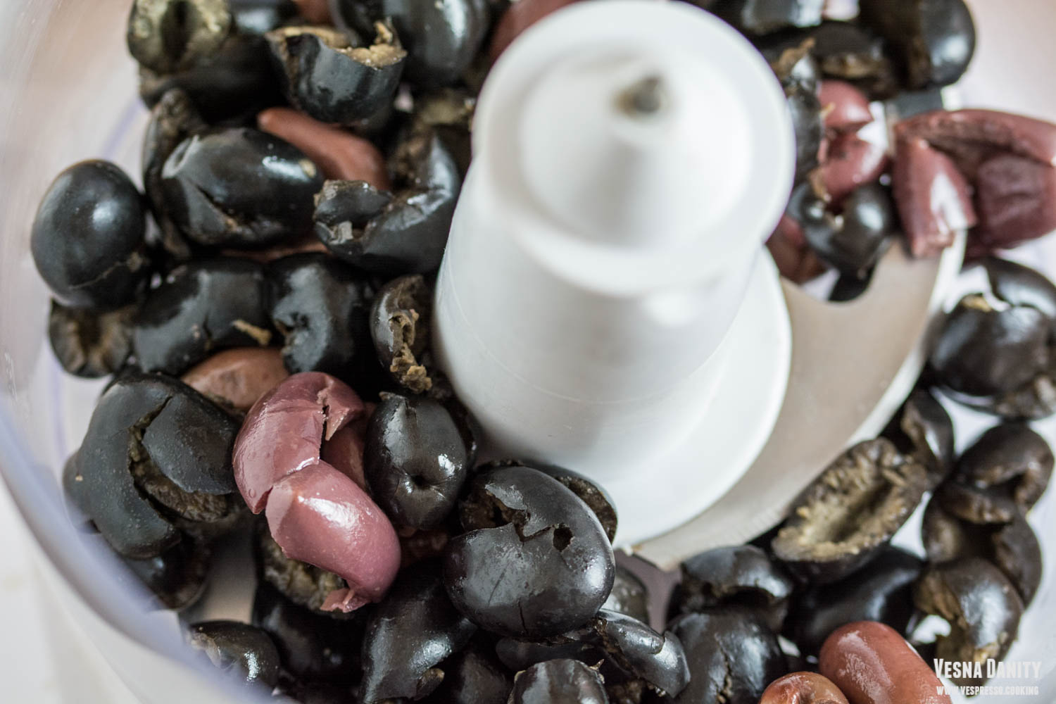 3. Mixarea măslinelor. Așez măslinele în vasul unui blender și le macin, adăugând câte o linguriță de ulei de măsline până când ajung la o consistență cremoasă, dar neomogenă.