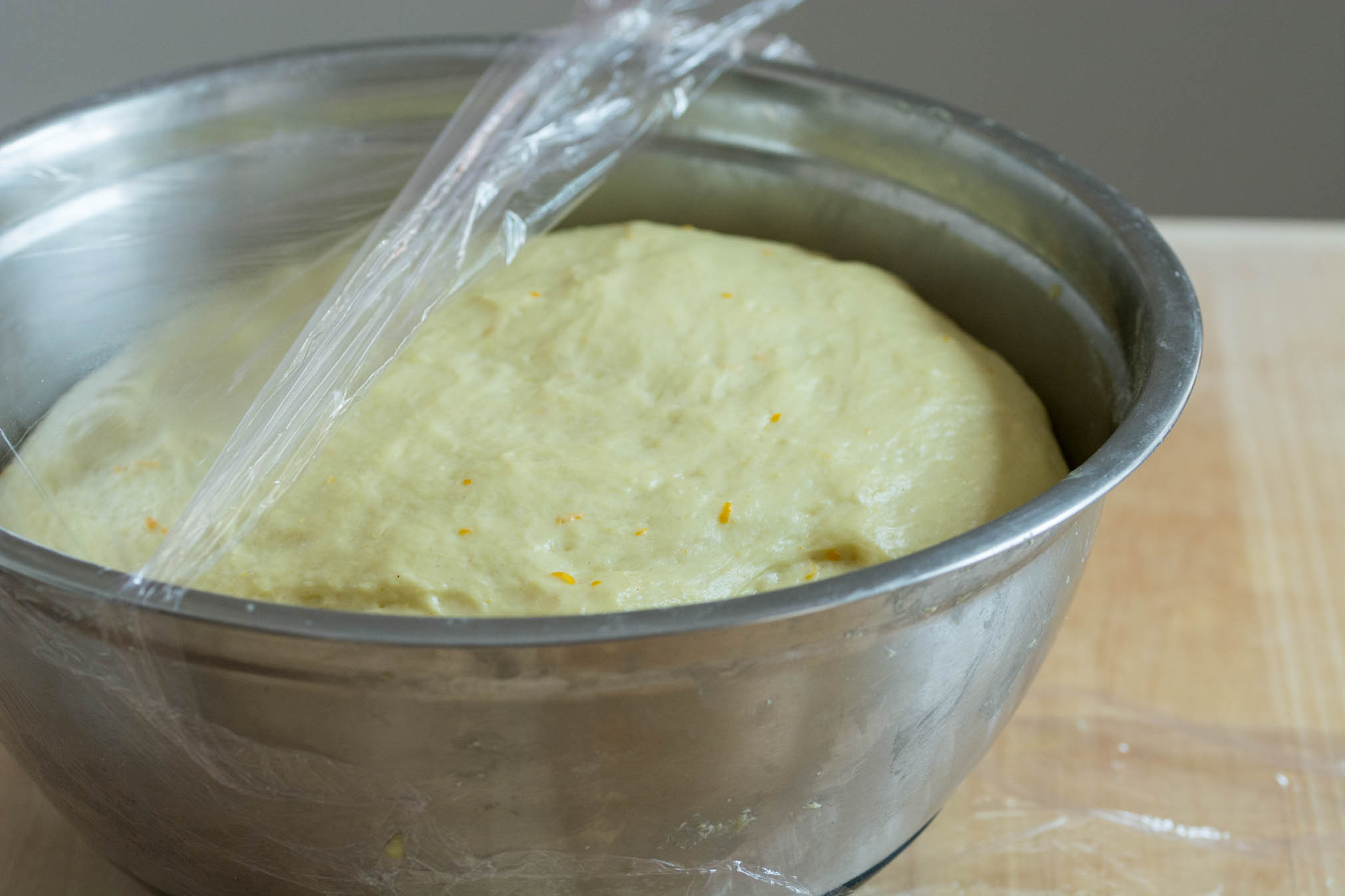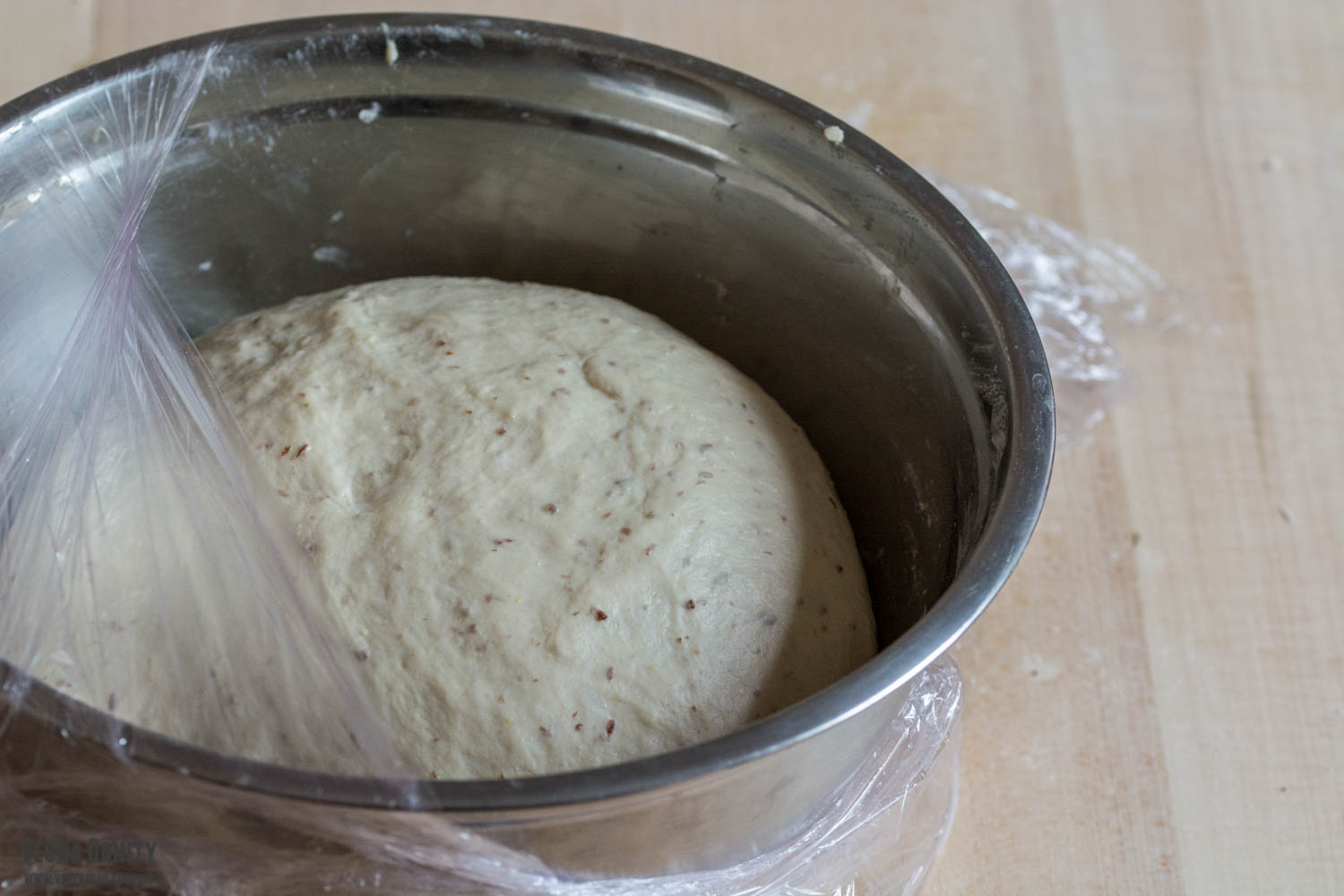 6. Dospirea aluatului. Am uns bolul cu 1 linguriță de ulei și am așezat aluatul în bol. Am acoperit bolul cu folie de prospețime peste care am așezat un prosop curat. Am așezat aluatul la dospit într-un loc cald până și-a dublat volumul (aproximativ o oră).