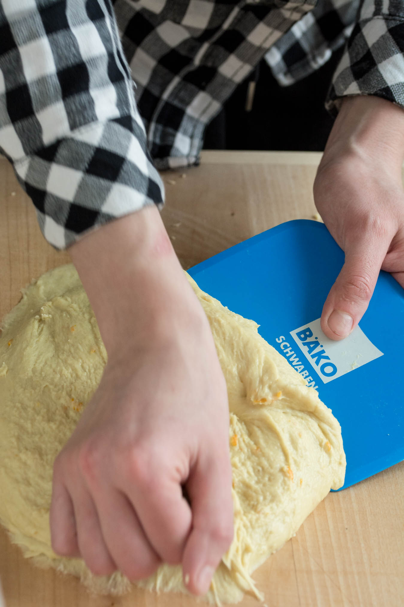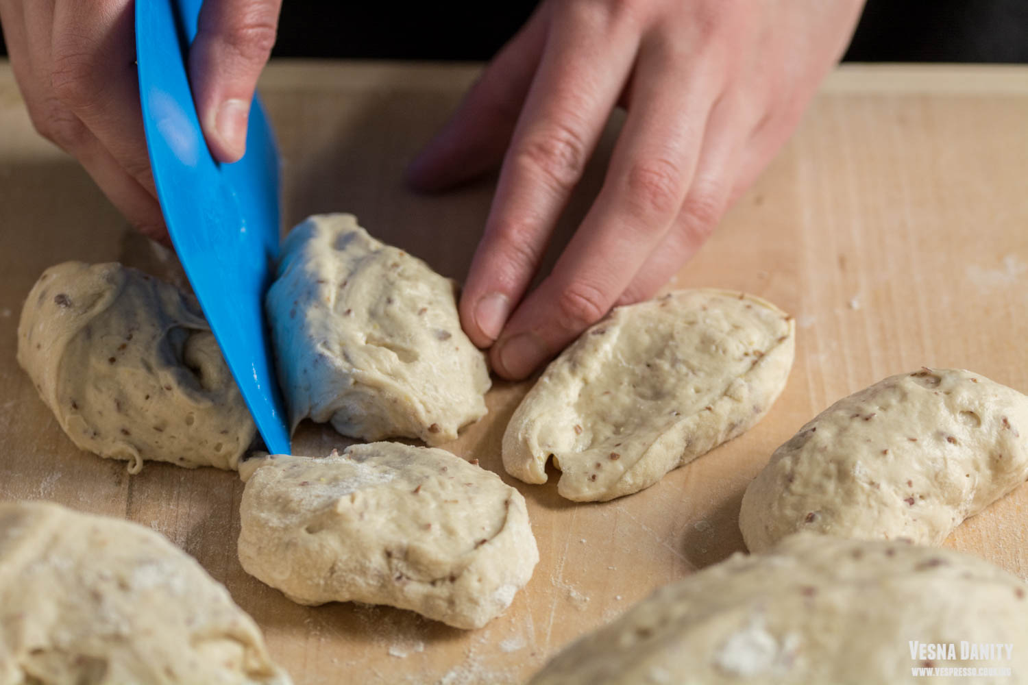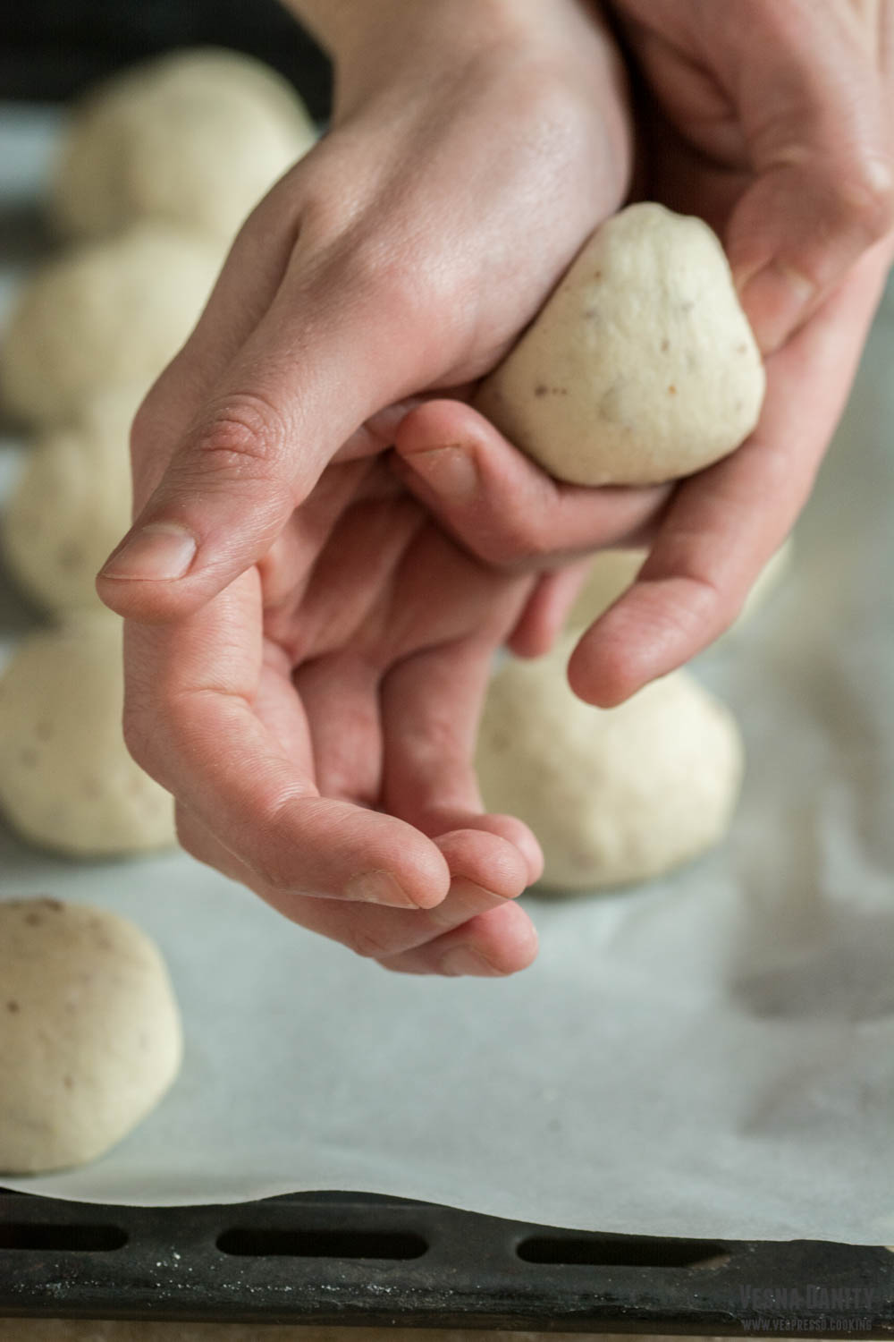 7. Modelare. Am încălzit cuptorul la 400°F/204°C (treapta 6). Cu ajutorul racletei am împărțit aluatul în 20 bucăți (pentru un plus de siguranță bucățile de aluat se pot cântări). Am luat o bucată de aluat și i-am dat o formă sferică.