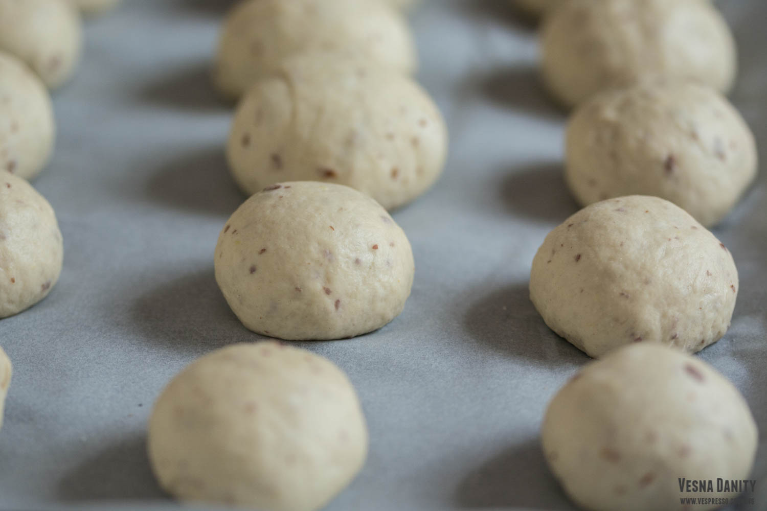 8. Dospirea chiflelor. Am așezat chiflele pe o tavă tapetată cu hârtie de copt și le-am mai lăsat vreo 30 minute la dospit, acoperite cu același prosop.