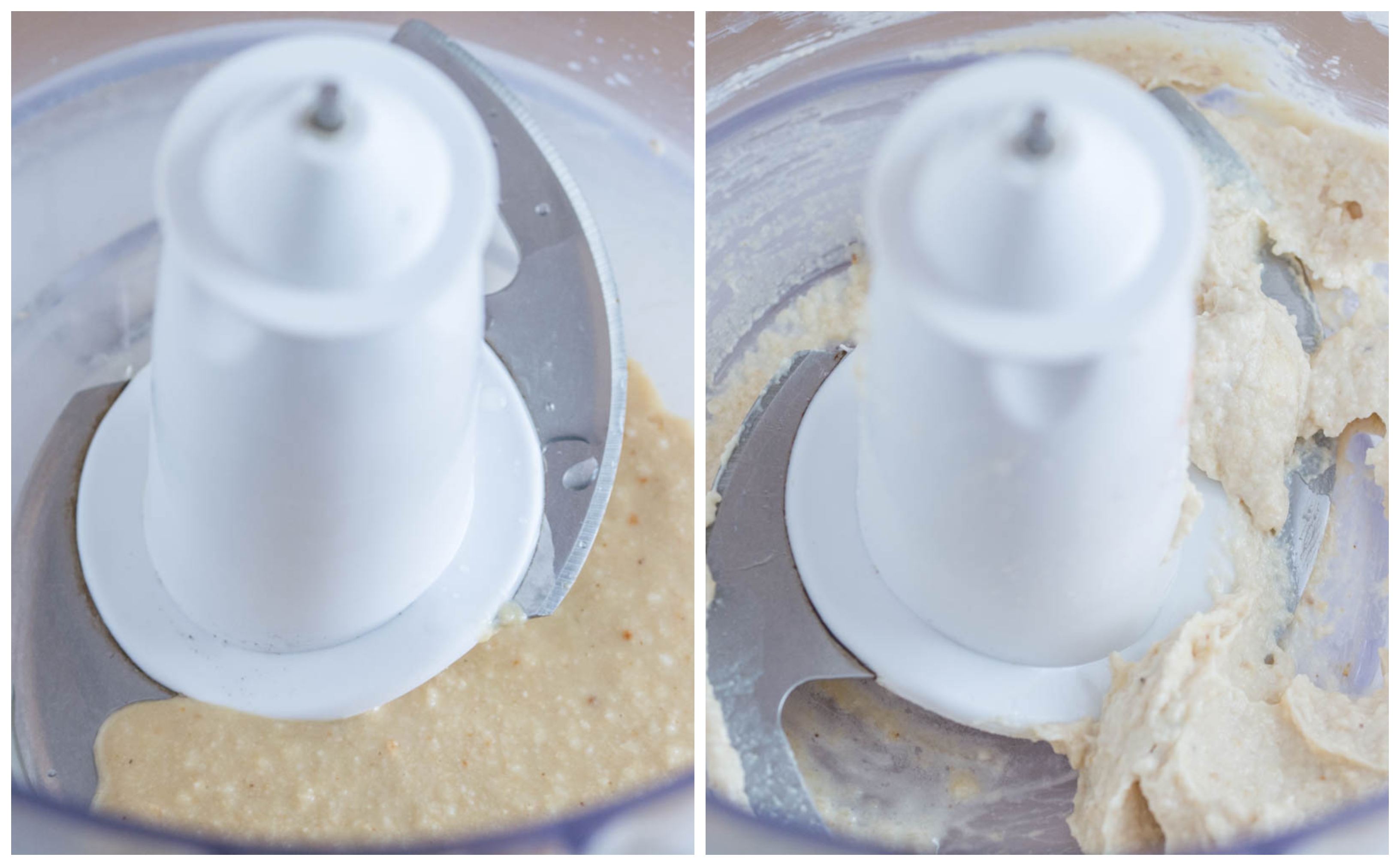 3. Am așezat pasta de susan (tahini) și sucul de lămâie în vasul robotului de bucătărie și am mixat până când am obținut o emulsie.