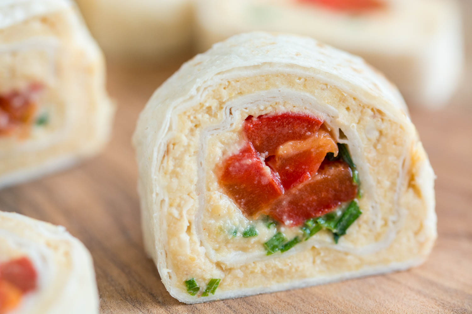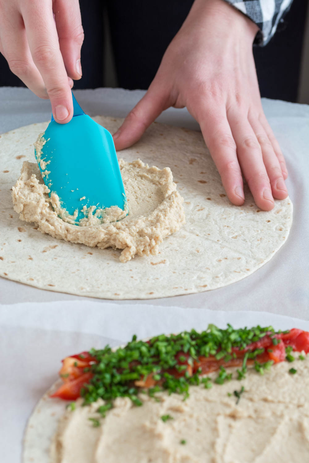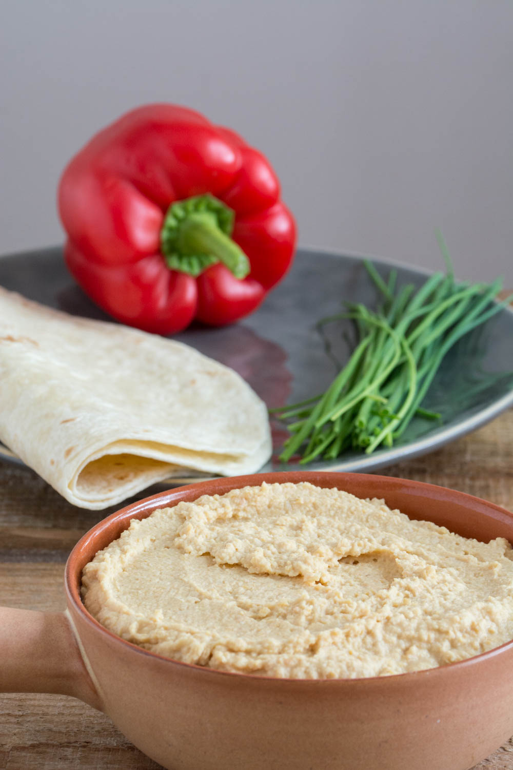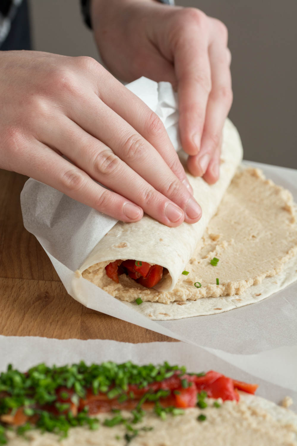 Rulouri de lipie cu hummus și ardei copt (vegan / de post)