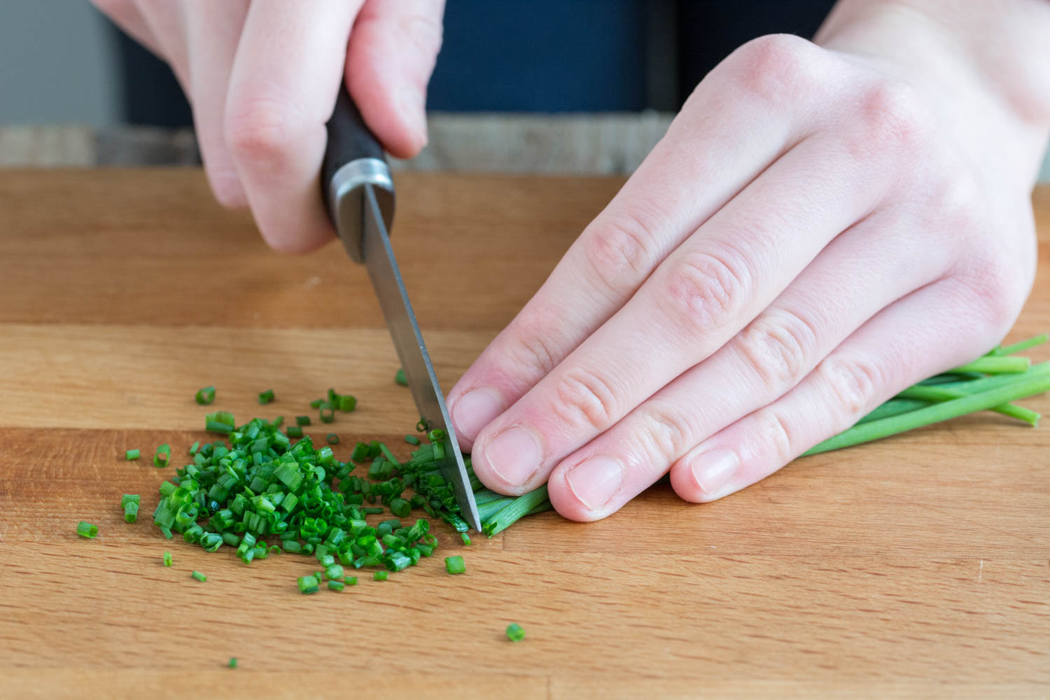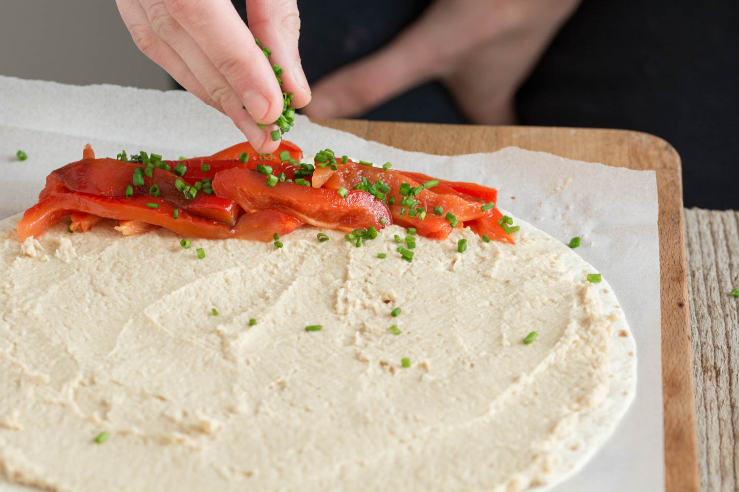 7. Asamblarea lipiei. Am luat cele 2 lipii și le-am așezat pe fiecare pe câte un pătrat de hârtie de copt (pentru a-mi fi mai ușor la rulare). Am împărțit hummusul obținut între cele 2 lipii. Am luat prima lipie și i-am distribuit uniform hummusul pe suprafața sa. Pe o margine a lipiei am așezat jumătate dintre feliile de ardei și le-am garnisit cu o jumătate de lingură de chives tocat.