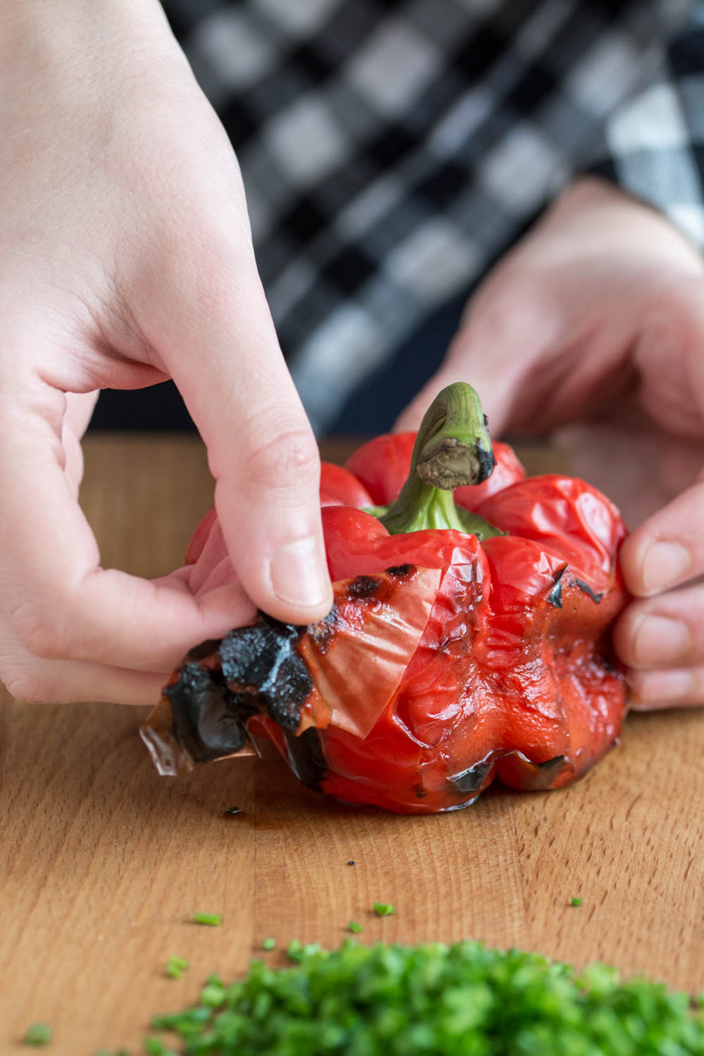 3. Decojirea ardeilor. Am decojit amândoi ardeii, le-am înlăturat cotorul și semințele, i-am clătit și i-am uscat cu un prosop de hârtie.