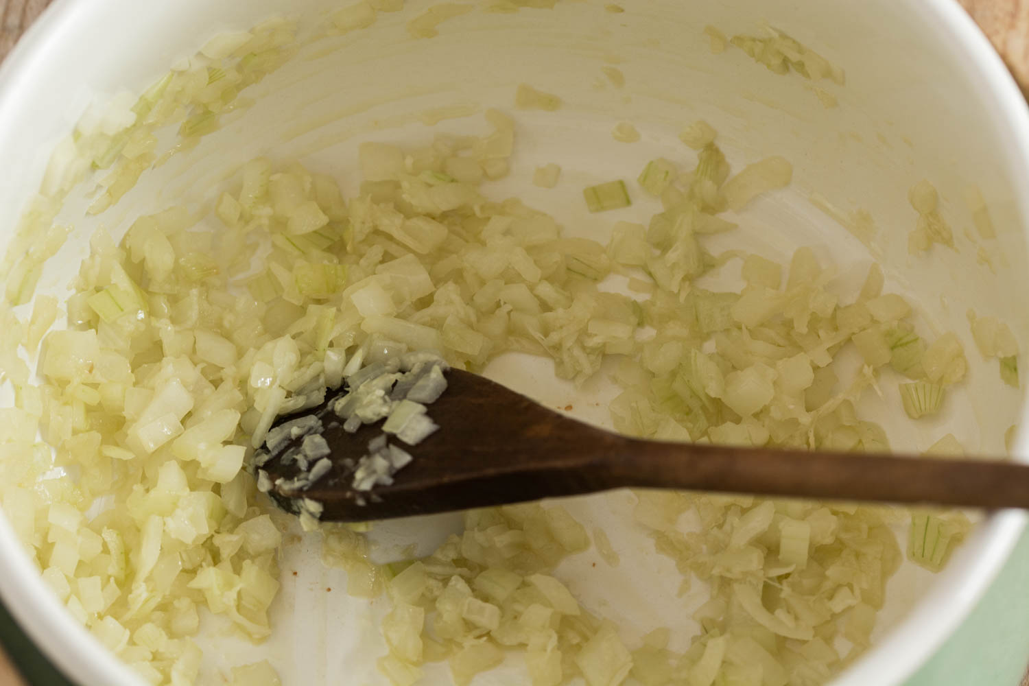 3. Sotarea legumelor. Am încins 3 lingură de ulei într-o oală de dimensiune medie. Am adăugat ceapa și am sotat-o vreo 3 minute, până când a devenit translucidă. Am adăugat usturoiul și l-am sotat și pe el până când a devenit parfumat (aproximativ 1 minut). Am adăugat condimentele și am amestecat.