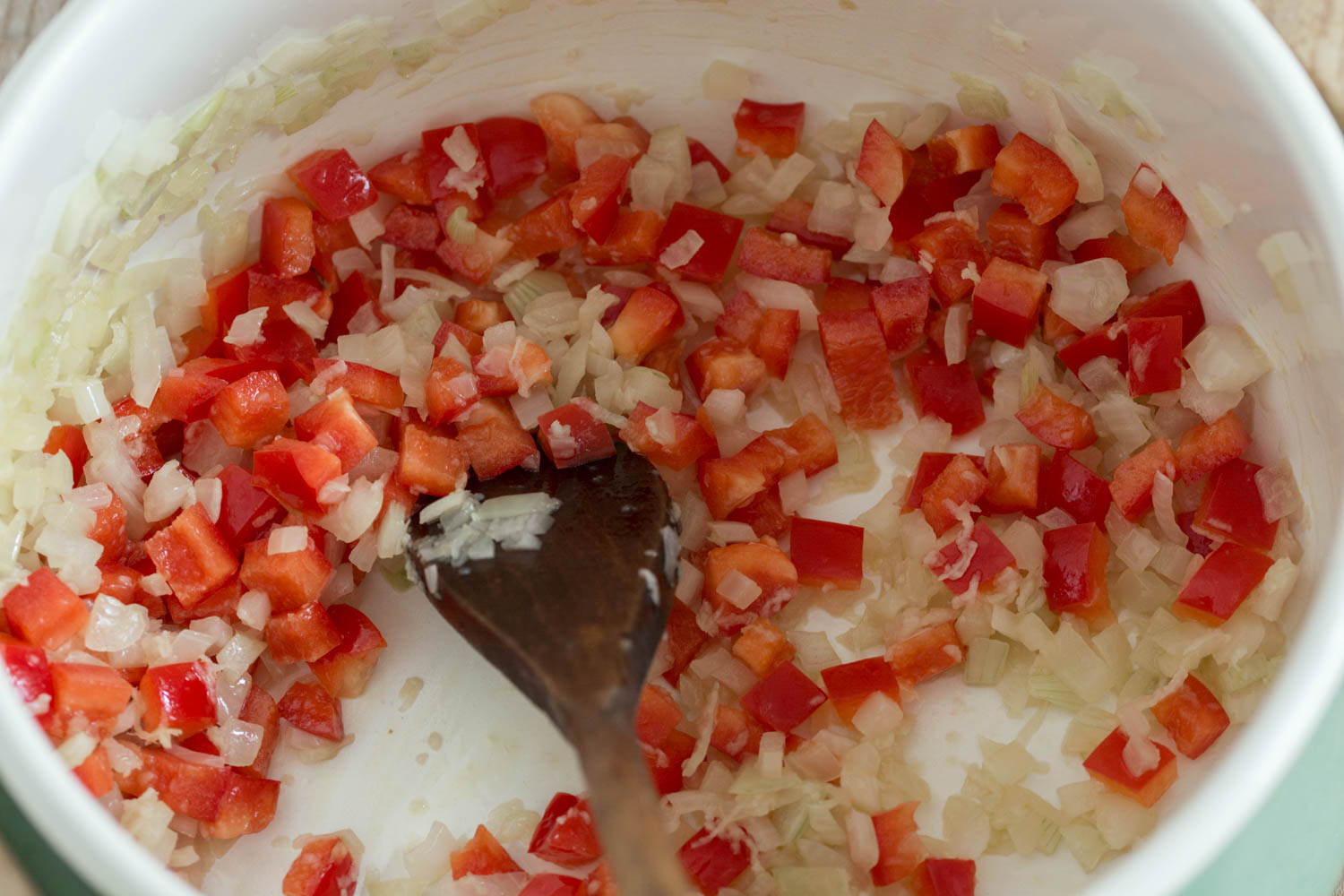 2. Pregătirea legumelor. Am curățat ceapa și am tocat-o fin. I-am îndepărtat ardeiului semințele și l-am tocat și pe el în cubulețe. Am decojit usturoiul și l-am tocat fin.