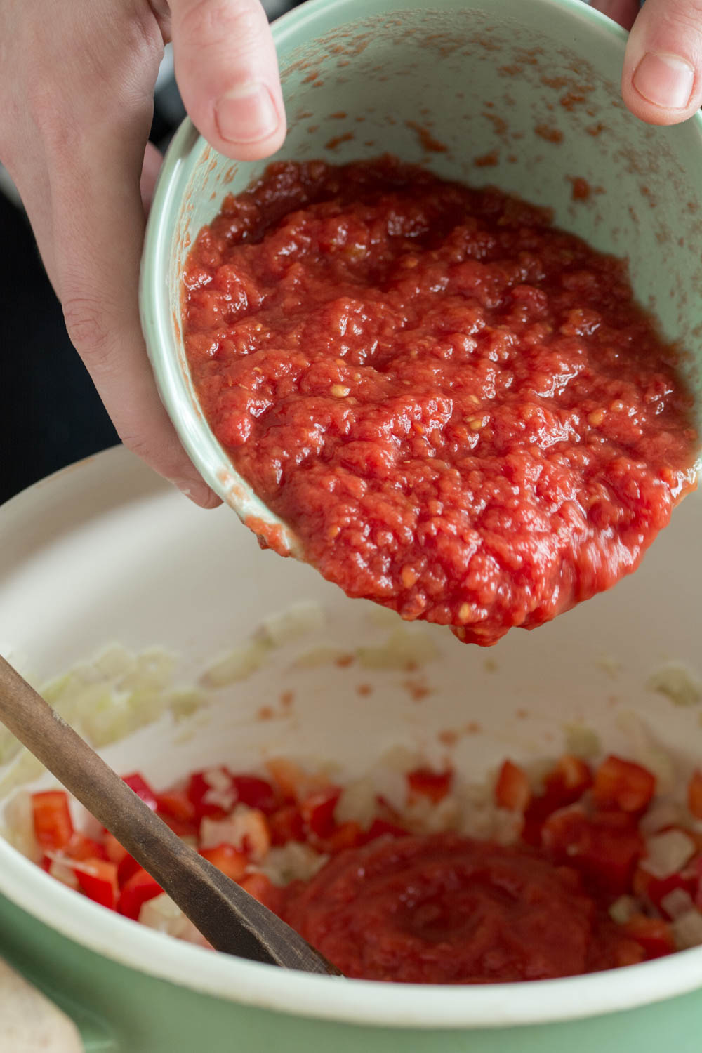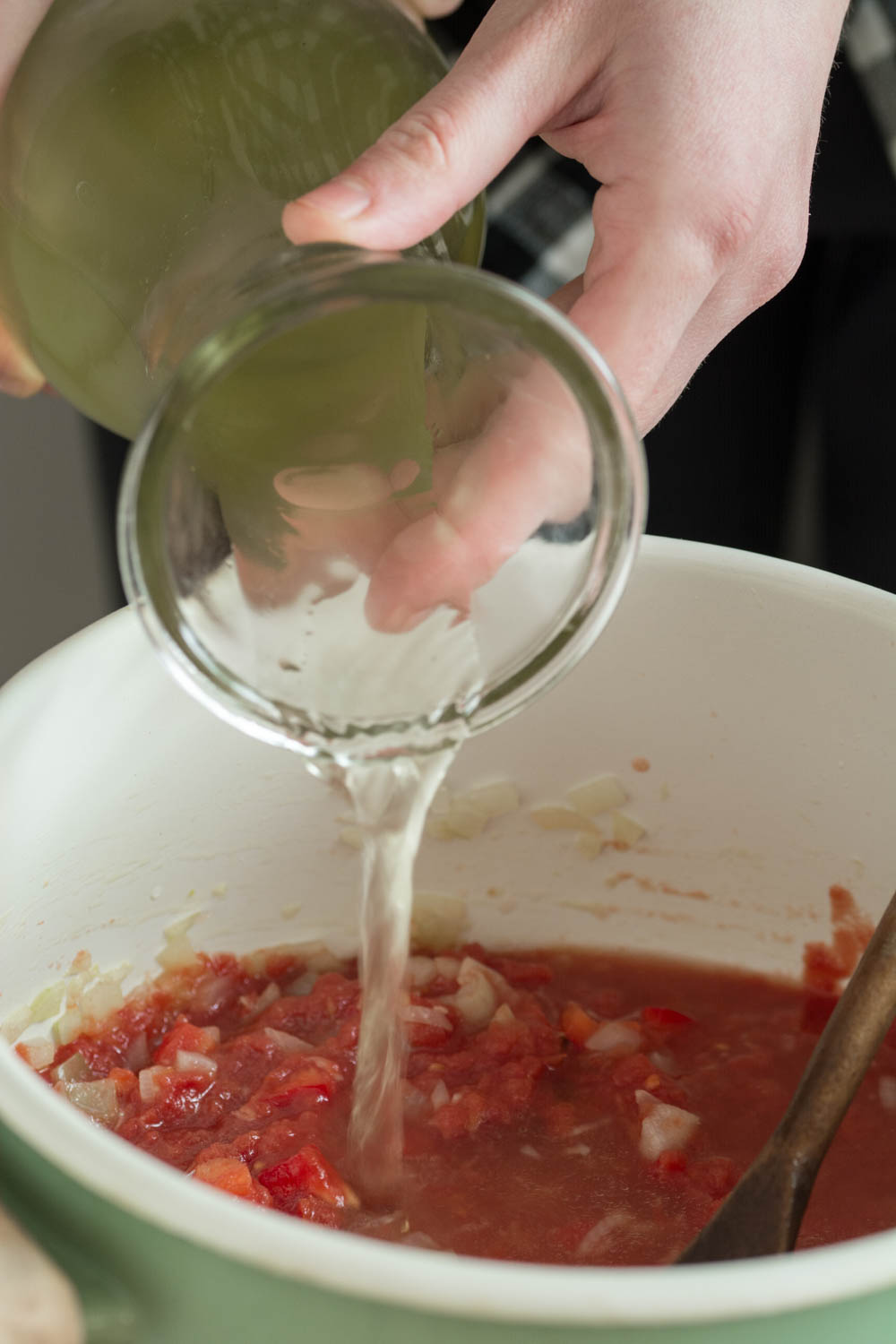 4. Adăugarea supei. Am adăugat conserva de roșii și supa de legume și am așteptat să dea supa în clocot, după care am redus focul la mic – mediu și am fiert-o timp de vreo 5 minute.