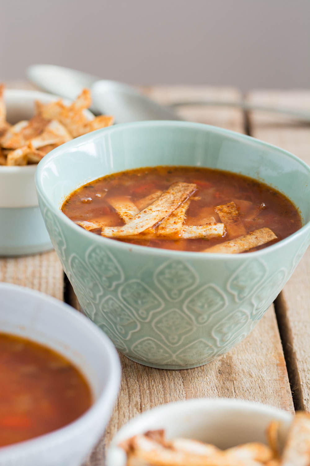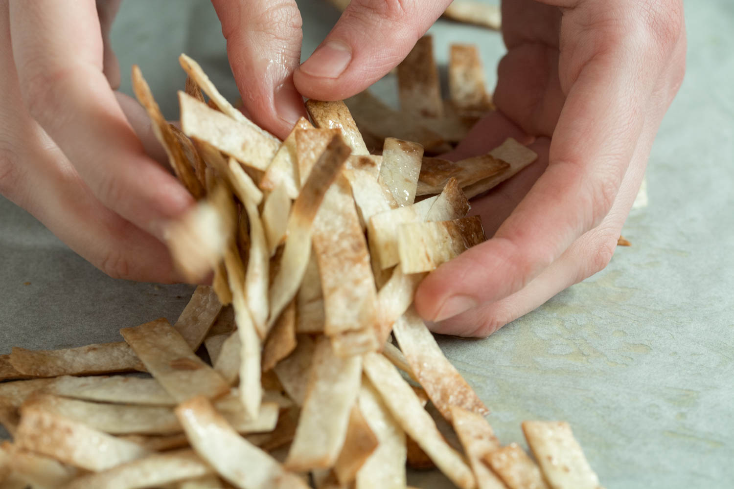 6. Pregătirea panglicilor de tortilla. Între timp m-am ocupat de tortilla. Am feliat-o în “tăiței” lați de 1 cm. I-am distribuit uniform pe o tavă acoperită cu hârtie de copt și i-am lăsat la cuptor pentru câteva minute, cât să se rumenească frumos.
