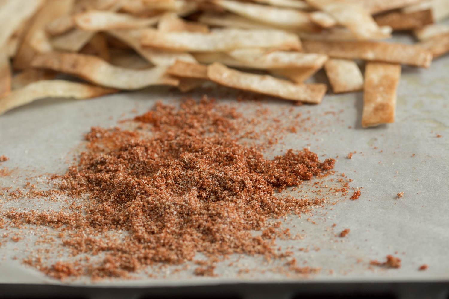 7. Asezonarea crutoanelor. I-am scos cu grijă din cuptor, i-am stropit cu cele 2 linguri de măsline și i-am pudrat cu amestecul meu de condimente.