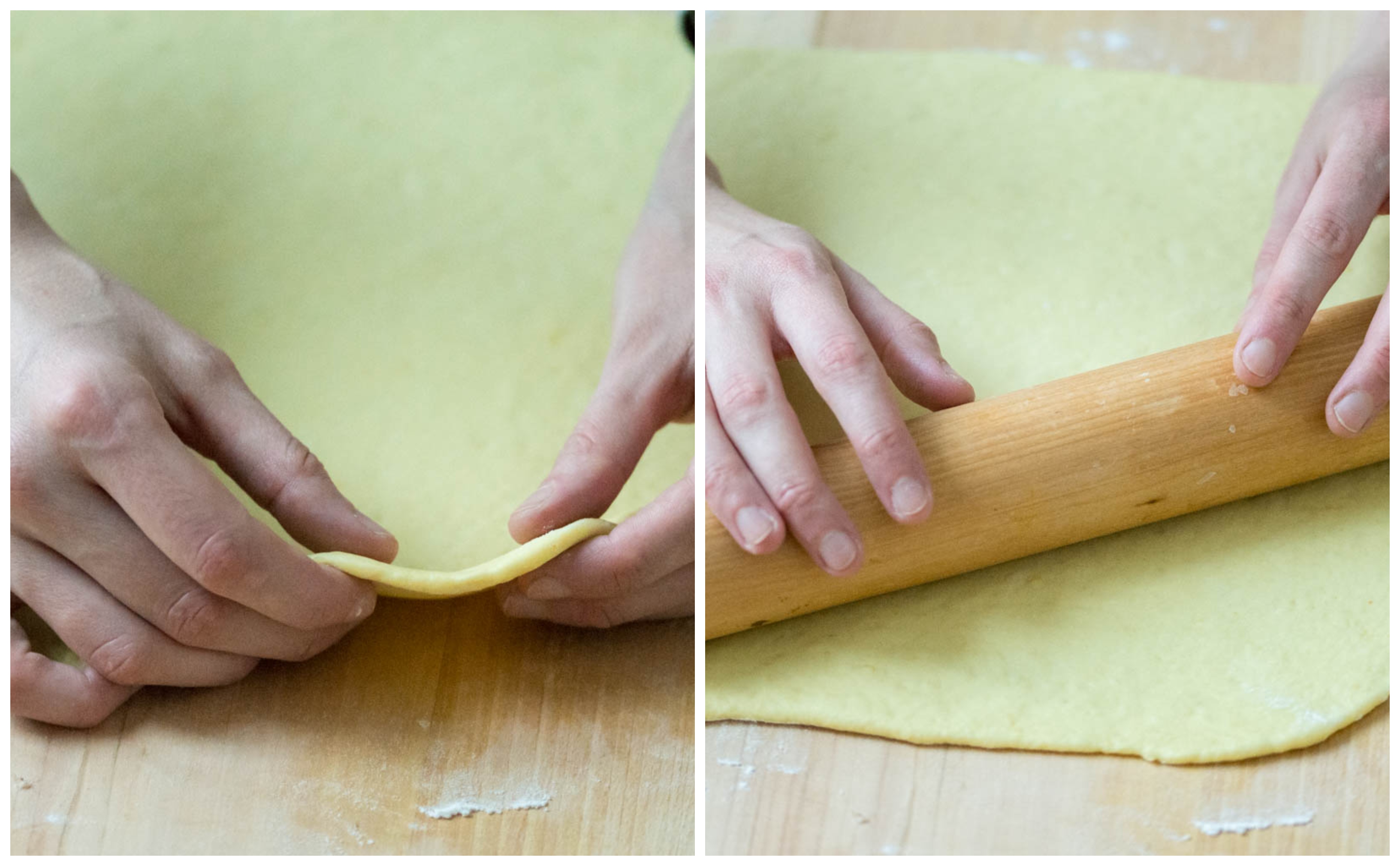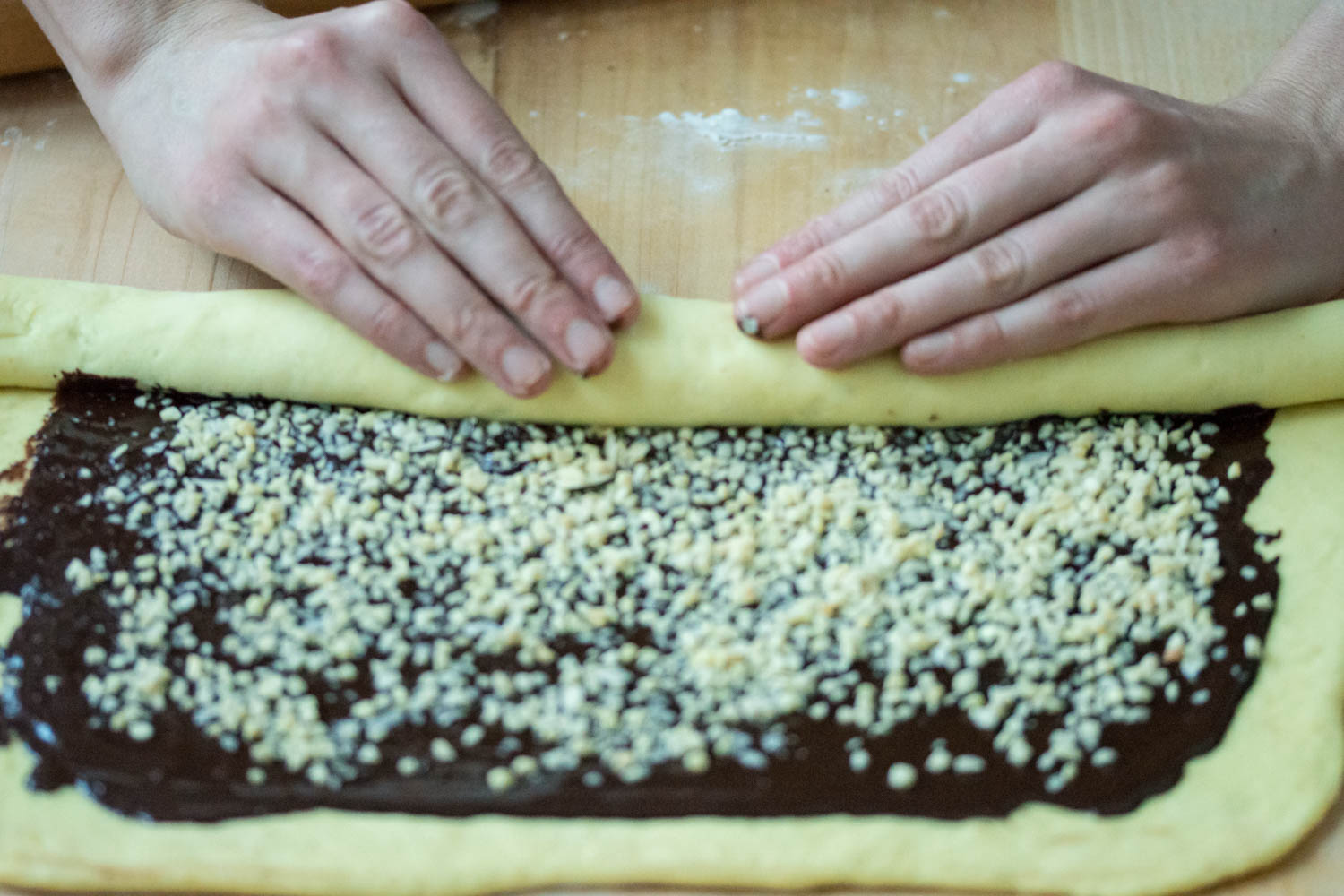 8. Rularea lipiei. Pornind dinspre partea cu ardeii copți și folosindu-mă de hârtia de copt, am început să rulez lipia cât mai strâns. Am procedat la fel și cu cea de-a doua lipie, după care le-am învelit pe fiecare în câte un pătrat de hârtie de copt. Am refrigerat ruladele pentru 1 oră înainte de a le tăia.