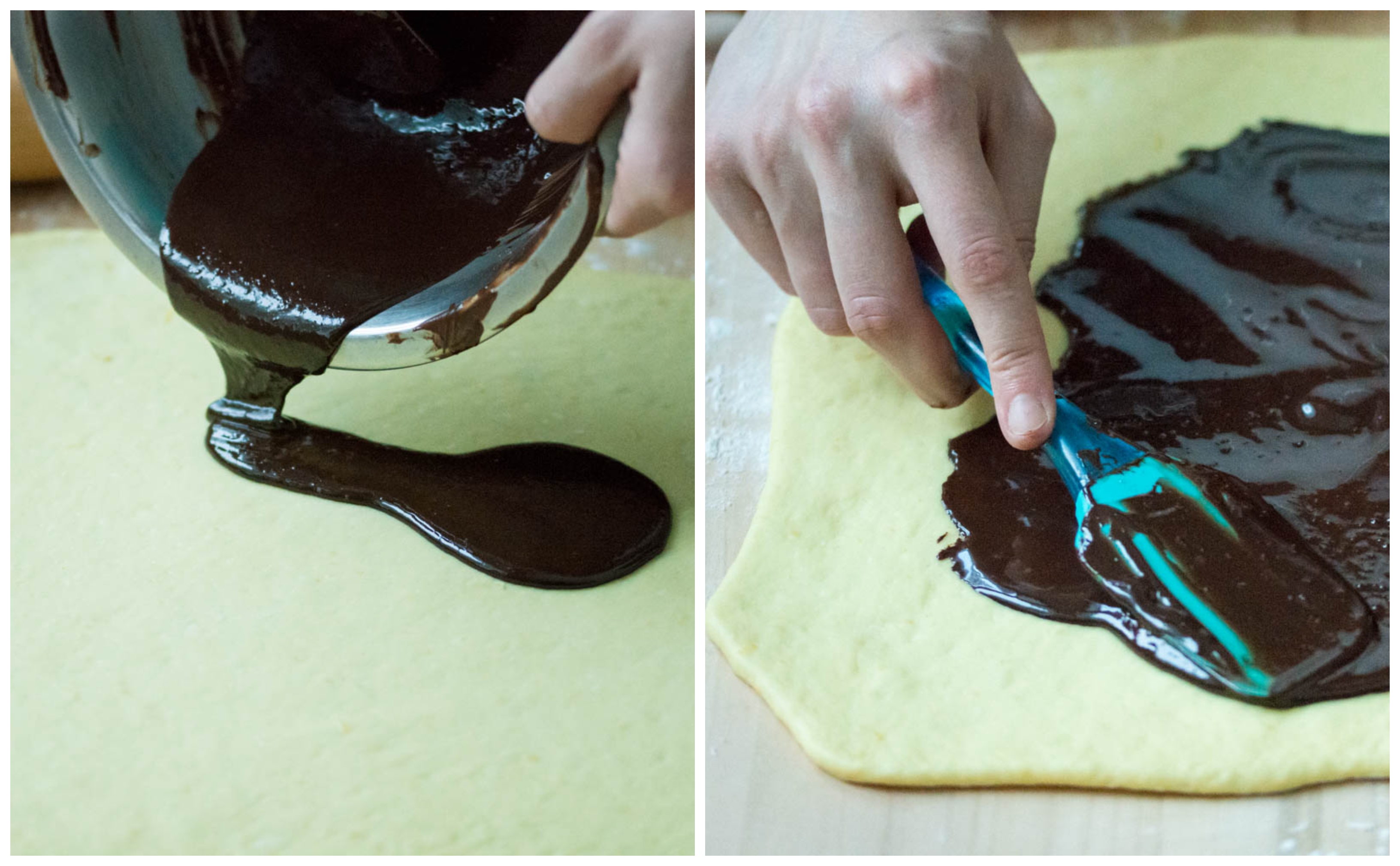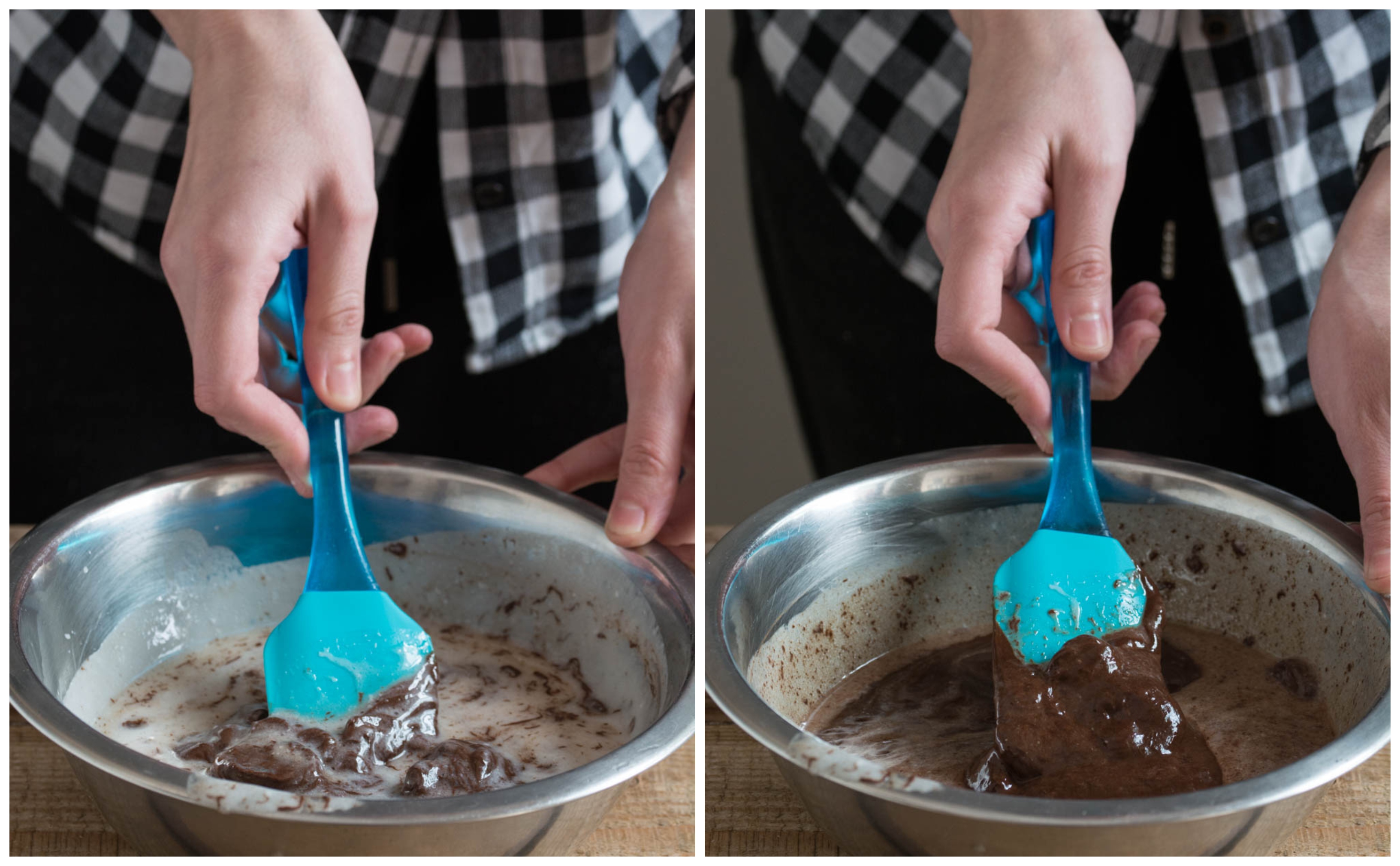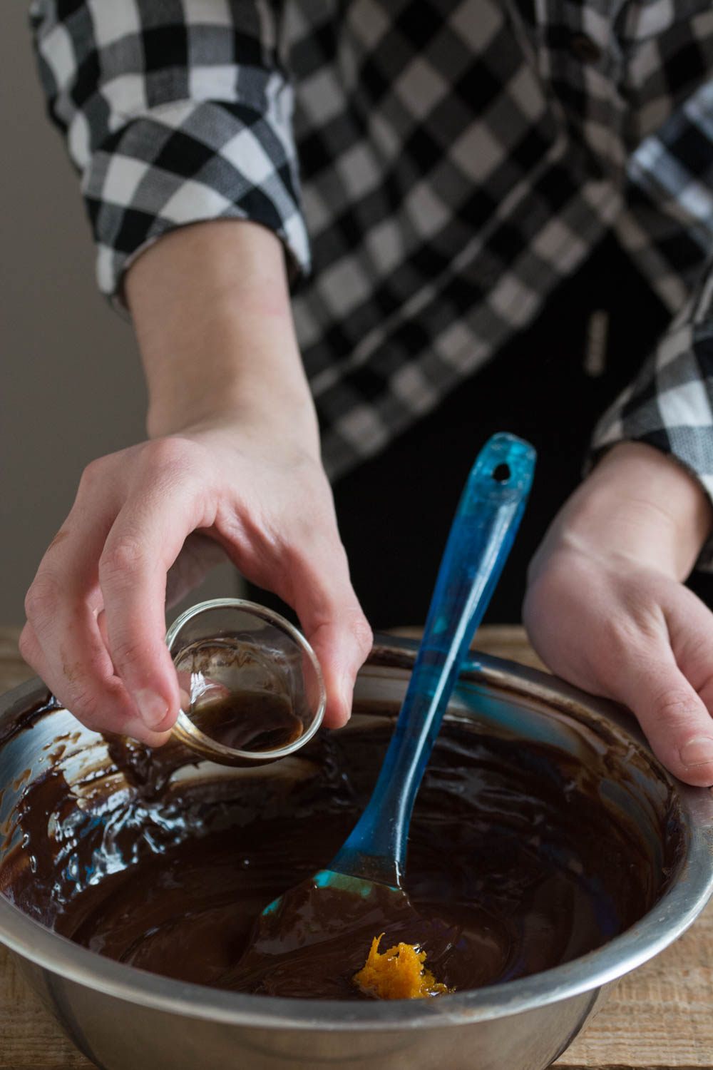 3. Prepararea ganache-ului. După ce au trecut cele 2 minute am început să amestec viguros până când am obținut o cremă fină. Am adăugat coaja de portocală și extractul de vanilie și am amestecat.