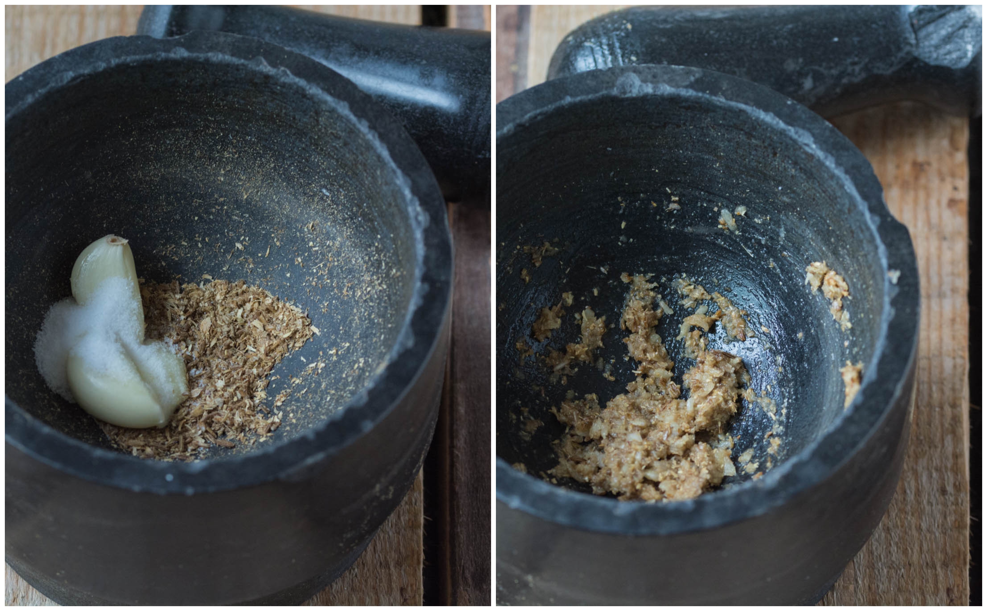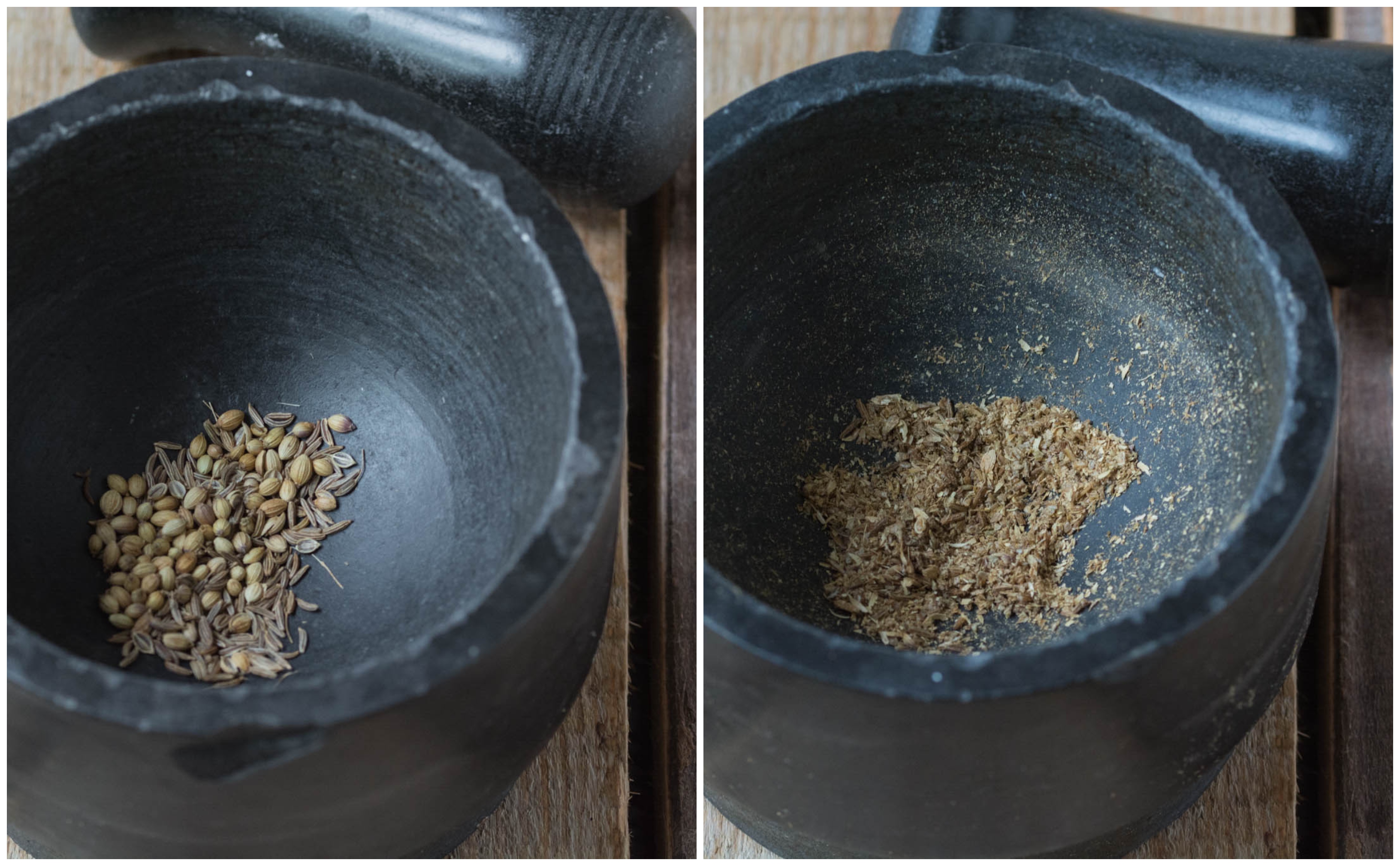 1. Condimentele. Am adăugat boabele de coriandru și chimen într-un mojar și le-am sfărâmat cu ajutorul unui pistil. Am adăugat sarea, paprika, chili și usturoiul și am continuat să le macin până când am obținut o pastă.