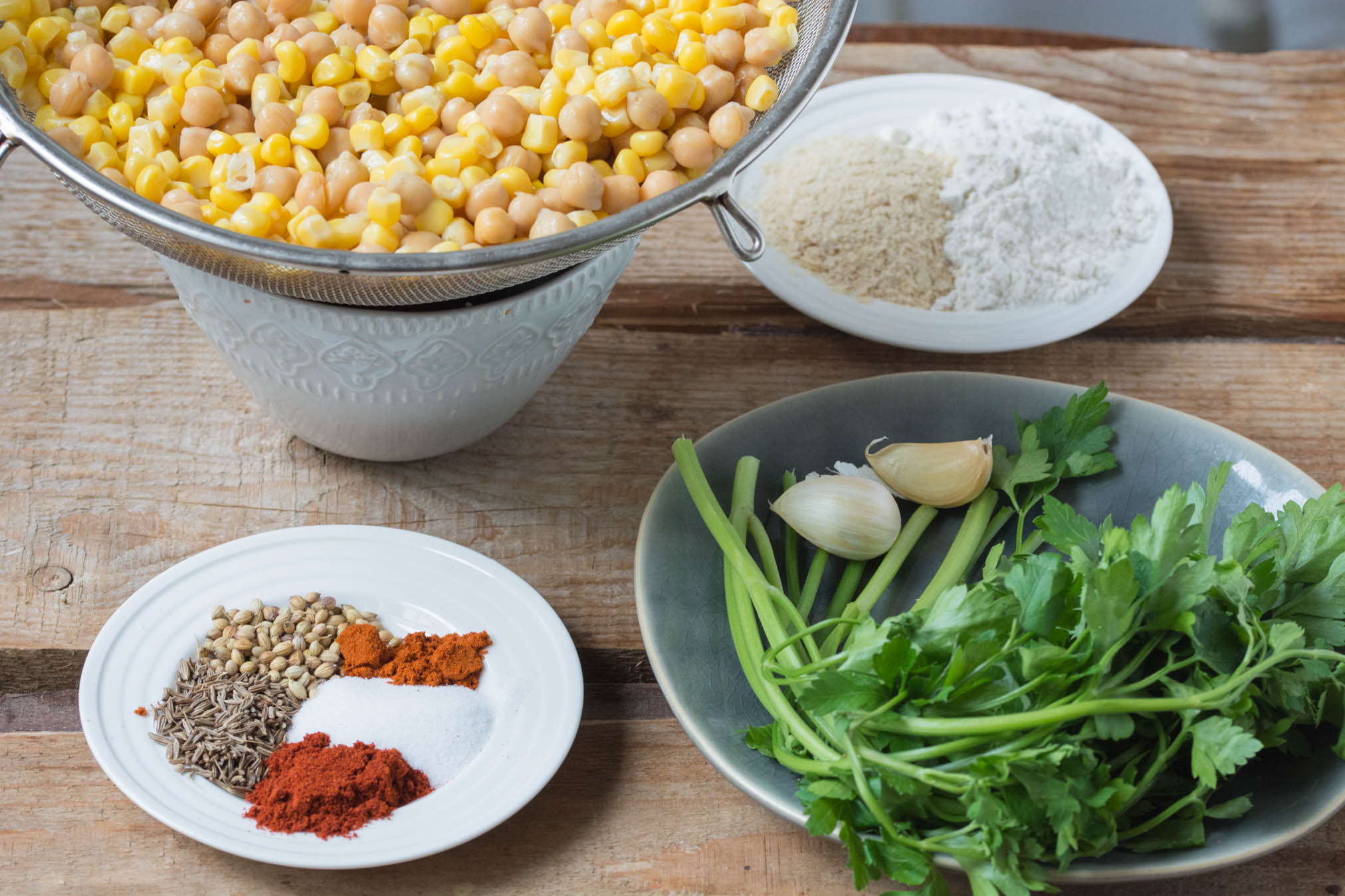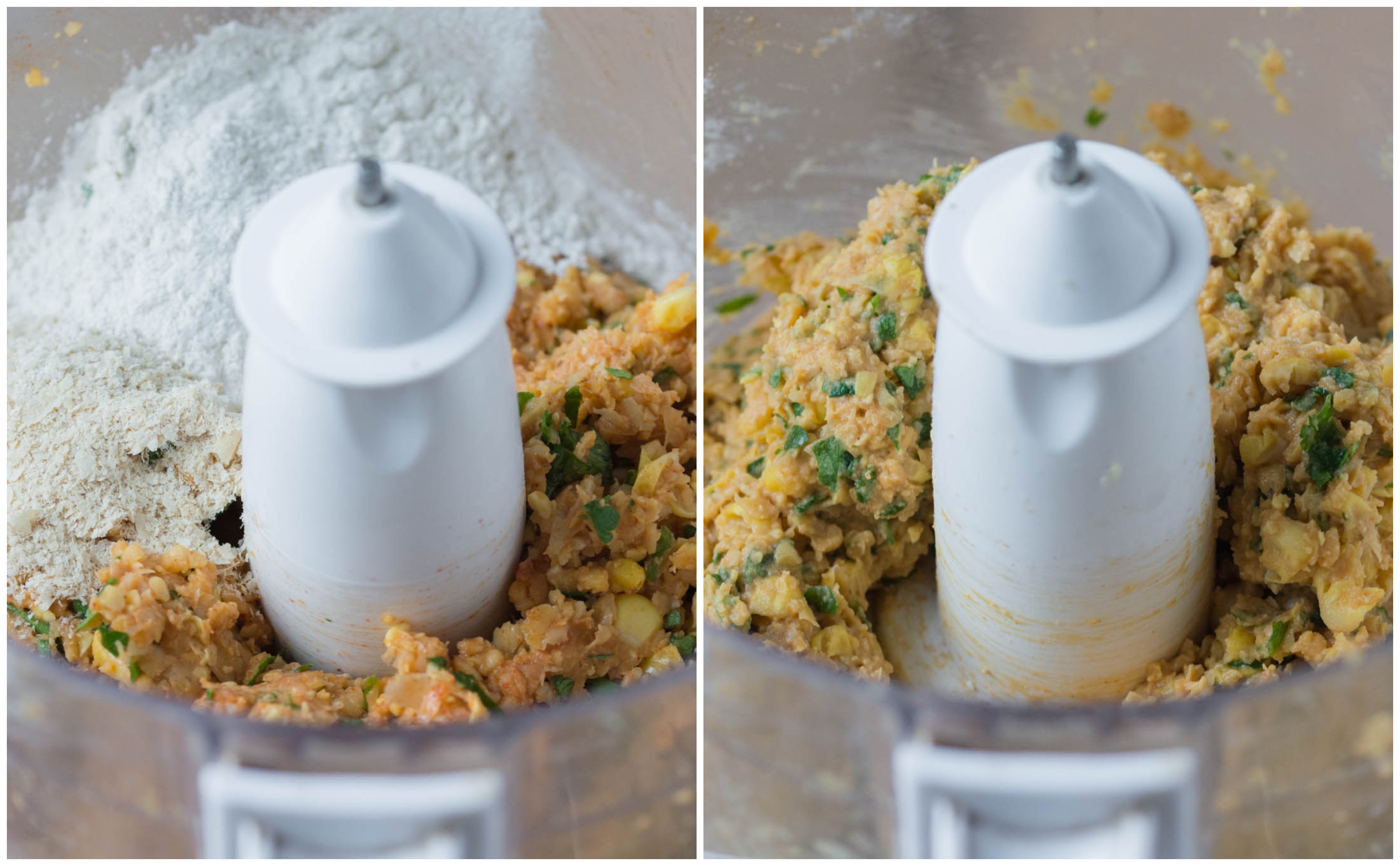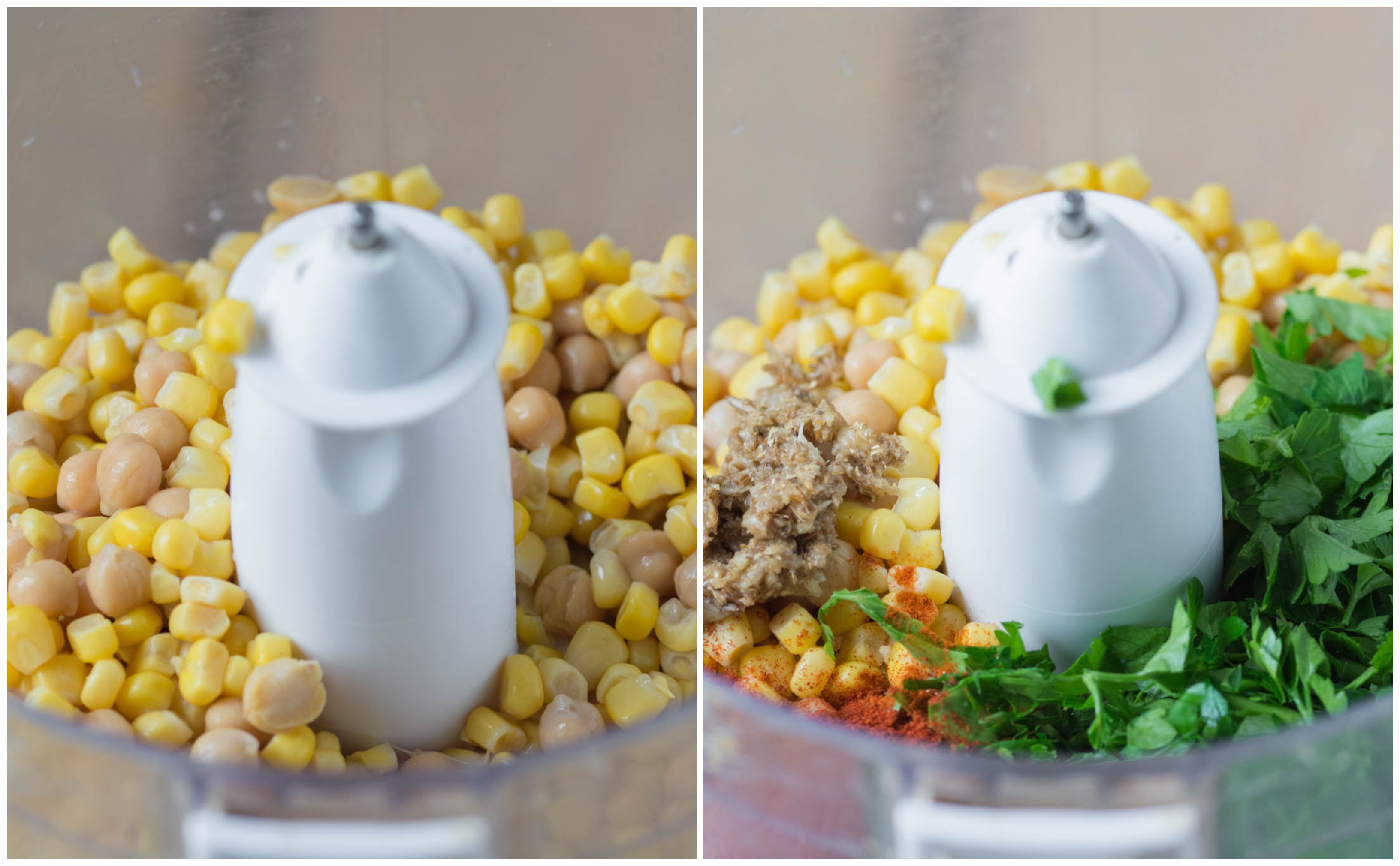 2. Mărunțirea ingredientelor. În vasul unui robot de bucătărie am adăugat năutul și porumbul și le-am mixat până când a rezultat o pastă neomogenă.