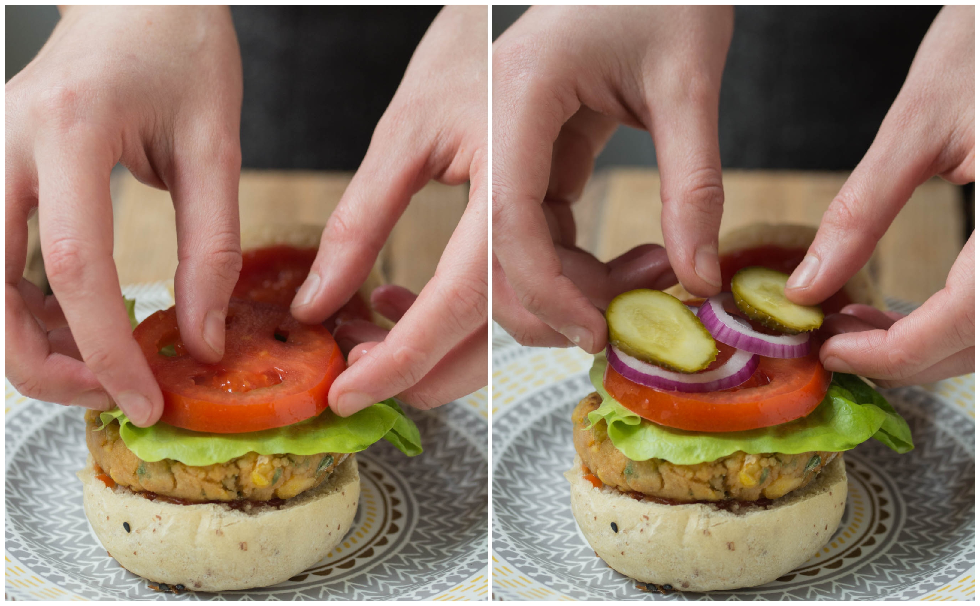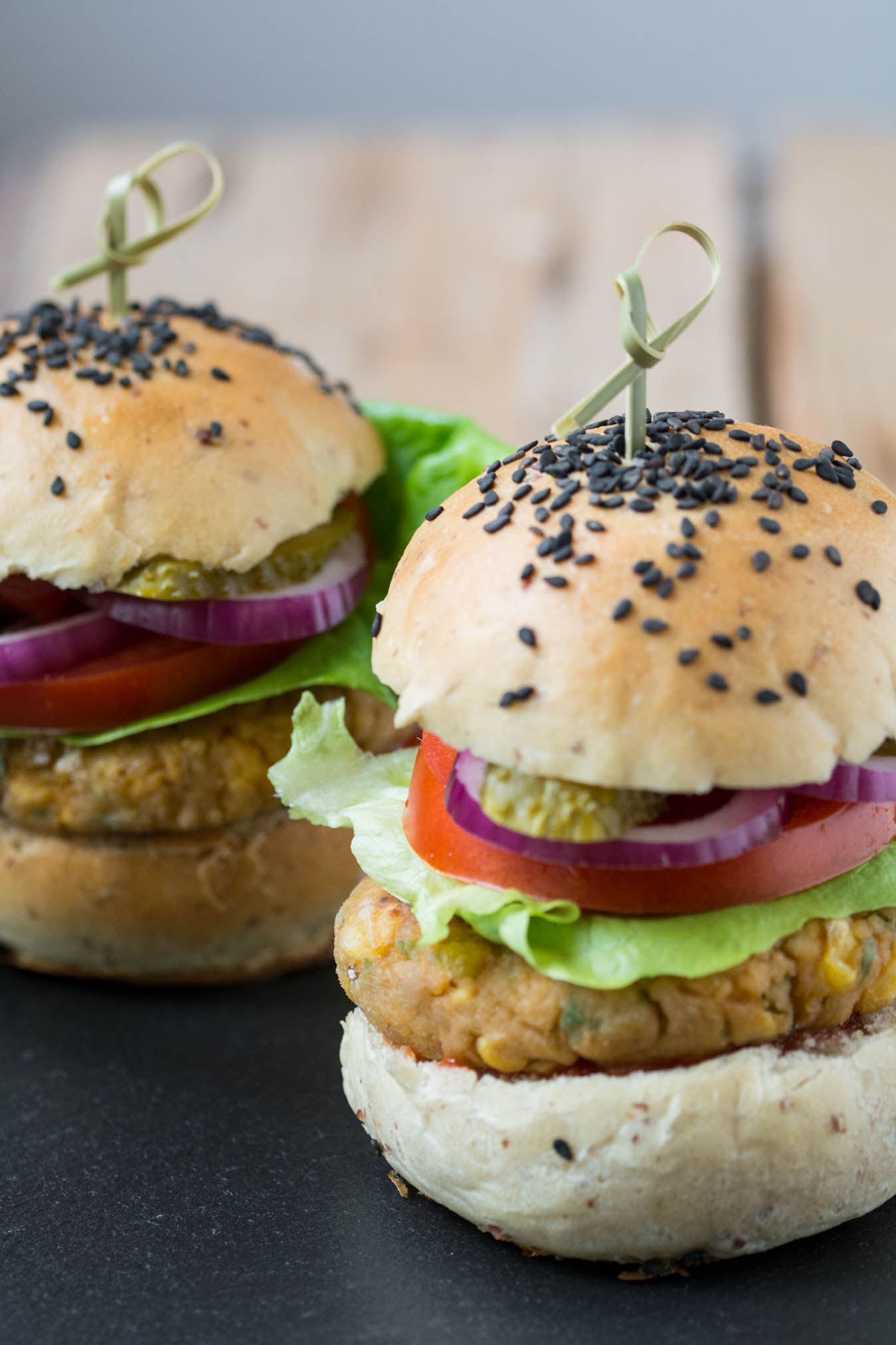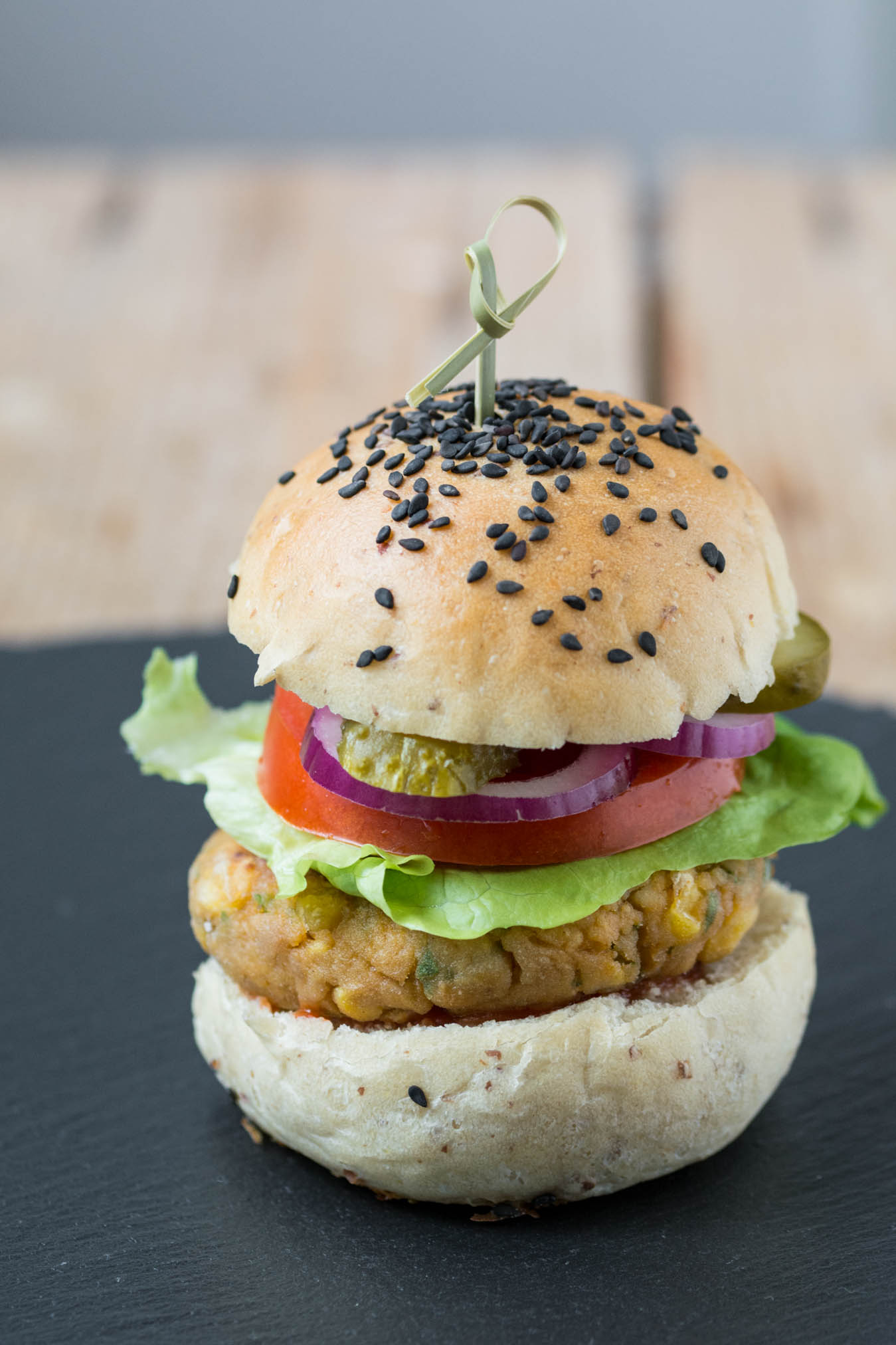 Mare devoratoare de burger din fire, n-avea cum să nu-mi ajungă la suflet această rețetă vegană absolut minunată. Această adaptare a arhicunoscutului și îndrăgitului preparat cu origini americane e pur și simplu divină – o delicioasă chiftea de legume cu un exterior crocant și un interior delicat și cremos care pur și simplu se topește în gură. Năutul și porumbul dulce crează baza acestei chiftele, notele de vârf fiind asigurate de pătrunjel, coriandru și chimion. Ca să mă bucur pe deplin de gustul ei nemaipomenit, am servit chifteaua minune în chifle făcute în casă, alături de castraveți murați, roșii proaspete și rondele de ceapă. Un adevărat festin!