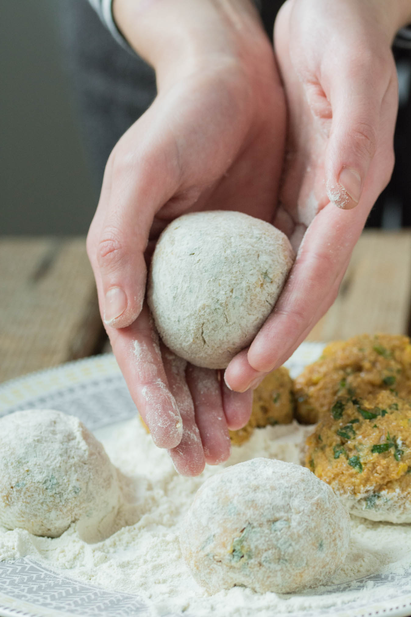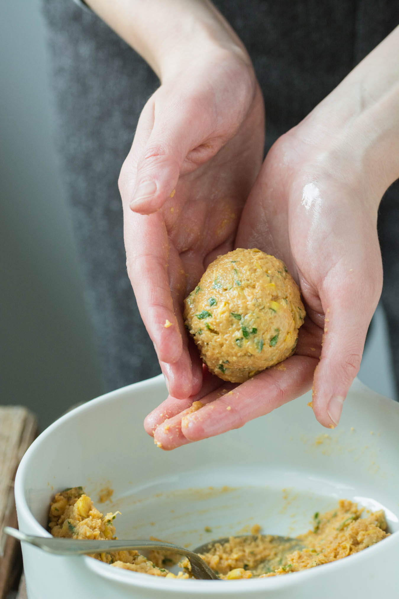 4. Formarea chiftelelor. Am împărțit compoziția în 6, i-am dat fiecărei chiftele o formă sferică după care le-am refrigerat pentru 30 de minute.
