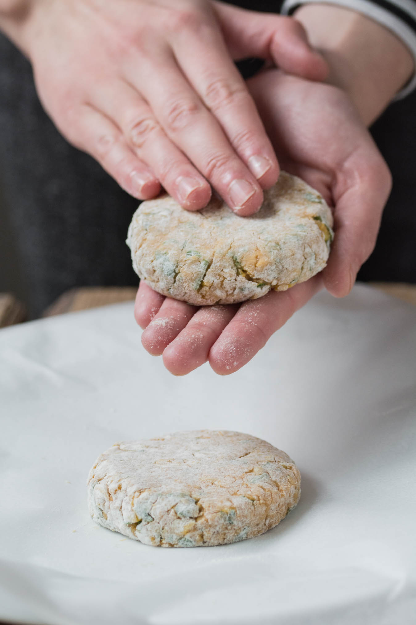 5. Modelarea chiftelelor. După 30 de minute am luat fiecare chiftea, am pudrat-o cu făină și am aplatizat-o.