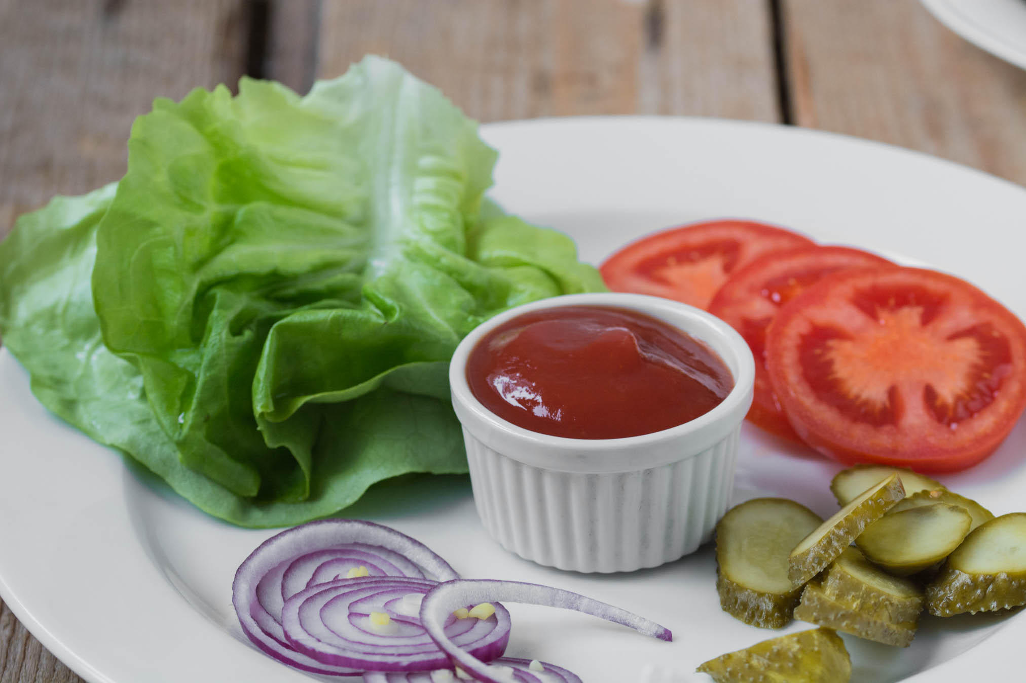7. Asamblarea burgerilor. Am tăiat chiflele în 2 (pe lățime), am adăugat ketchup, câte o chiftea, salată, castraveți murați, rondele de roșie și ceapă roșie.