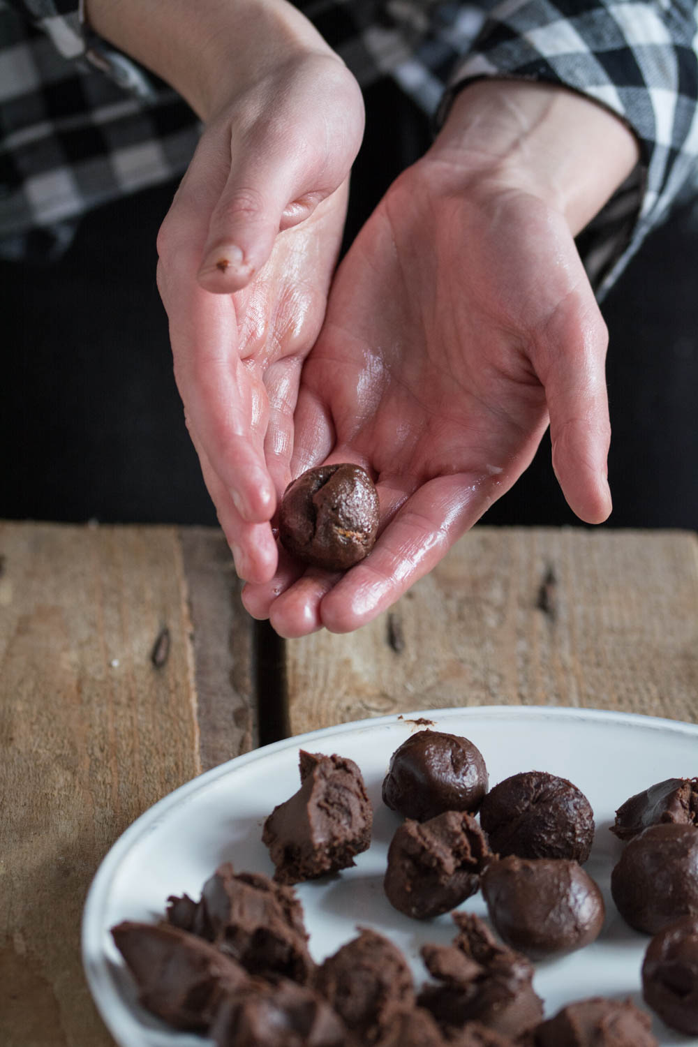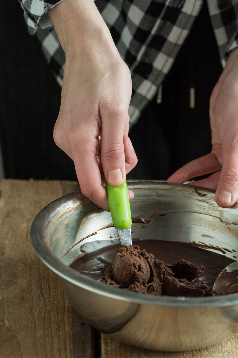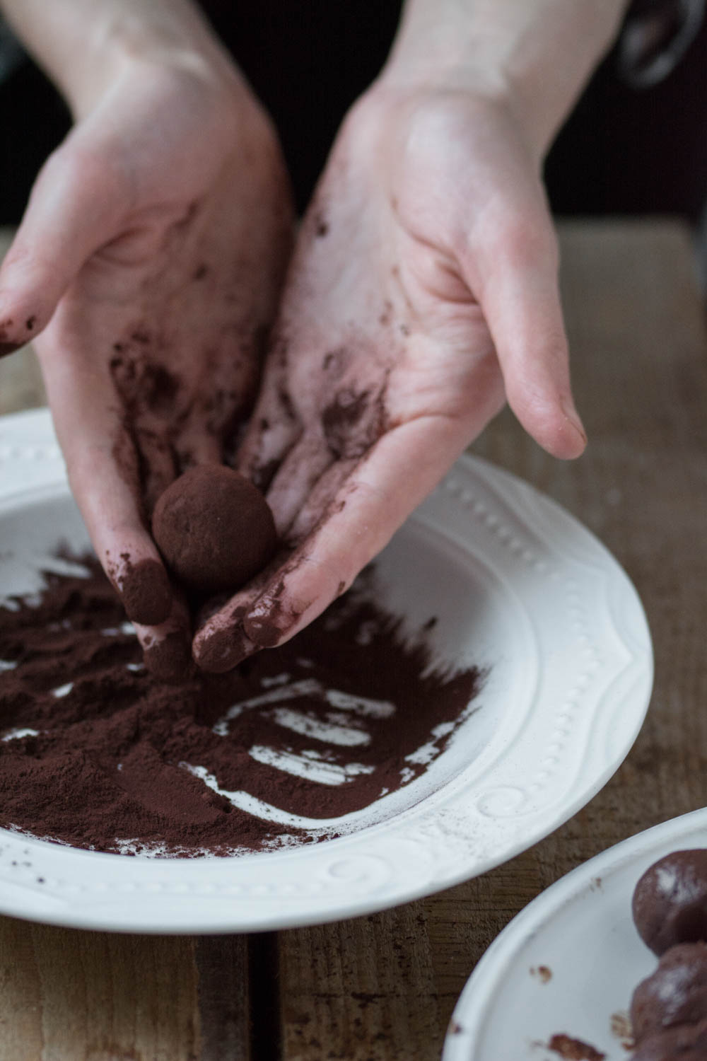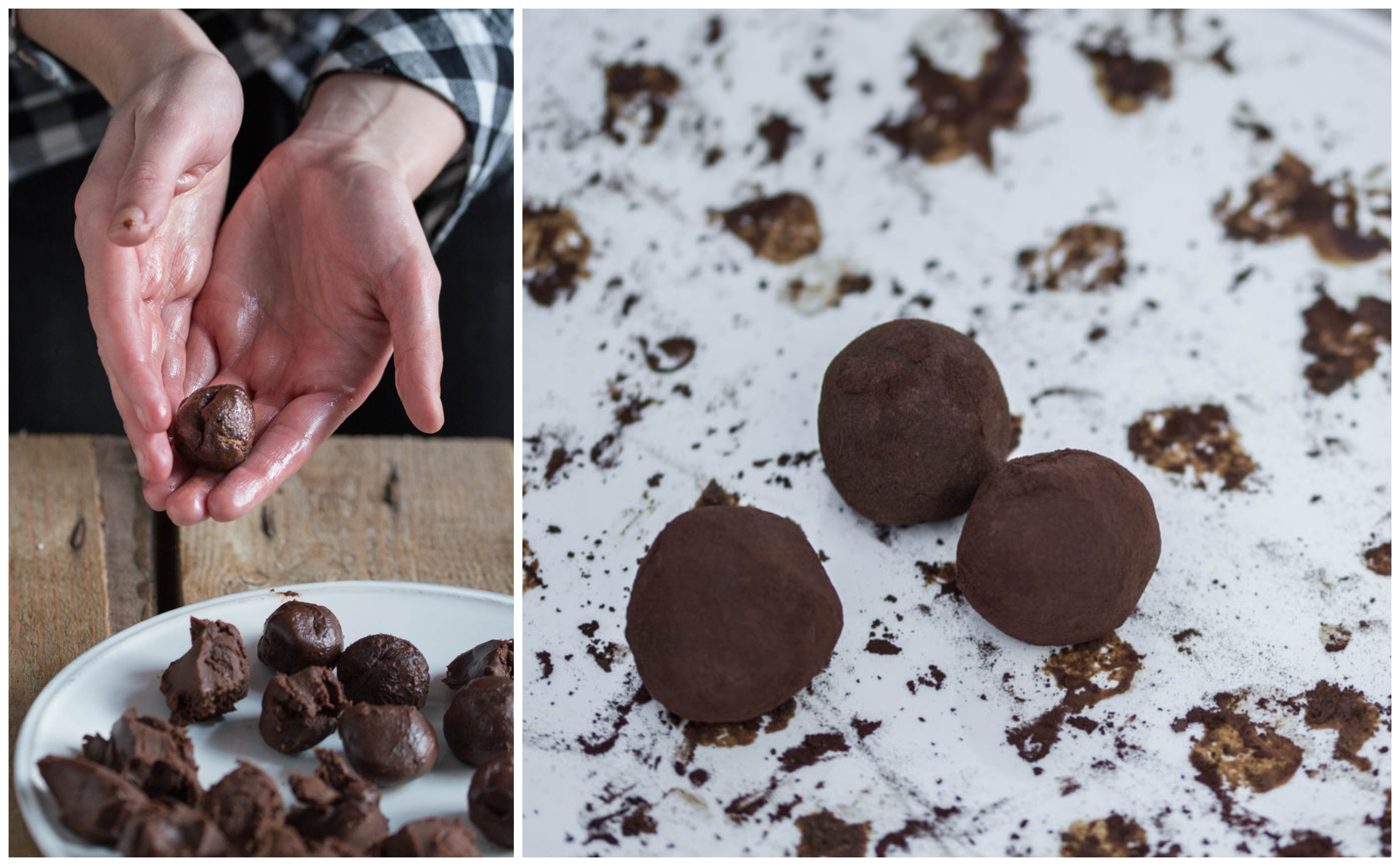 5. Modelarea trufelor. Cu ajutorul unei noisette (instrument cu care se formează mingiuțele de pepene) am format trufele, după care le-am dat o formă sferică cu ajutorul degetelor unse cu ulei. Le-am pudrat cu cacao și le-am refrigerat până la consum.