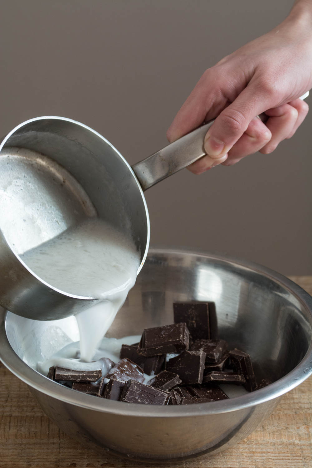 2. Încălzirea cremei de cocos. Am așezaat crema de cocos într-o cratiță și am încălzit-o până când au început să iasă aburi. Am turnat crema fierbinte peste cubulețele de ciocolată și am lăsat bolul deoparte pentru 2 – 3 minute.