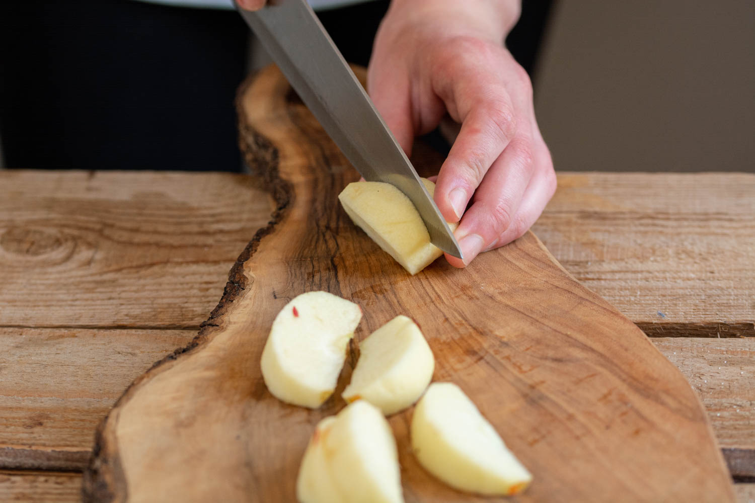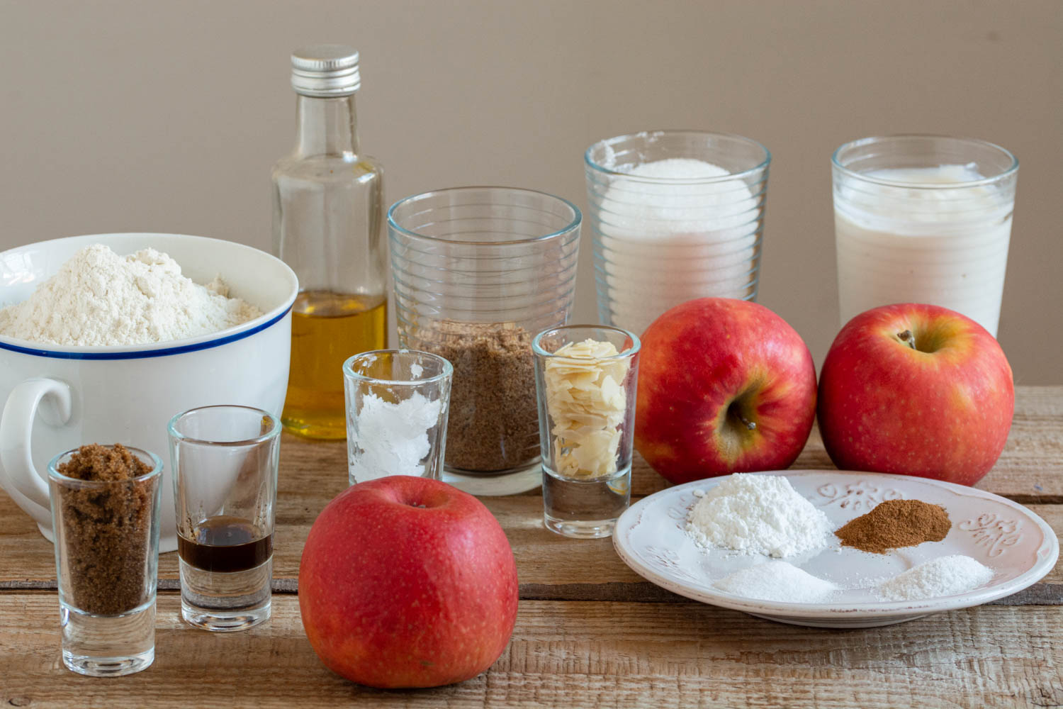 2. Pregătirea ingredientelor. Am cântărit ingredientele. Am curățat merele, le-am tăiat în 4, am îndepărtat cotoarele, după care am împărțit fiecare sfert în 3 felii. Am râșnițat semințele de in (ele se pot zdrobi într-un mojar în lipsa unei râșnițe). Le-am hidratat în 9 linguri de apă, după care am lăsat amestecul deoparte pentru 5 minute.