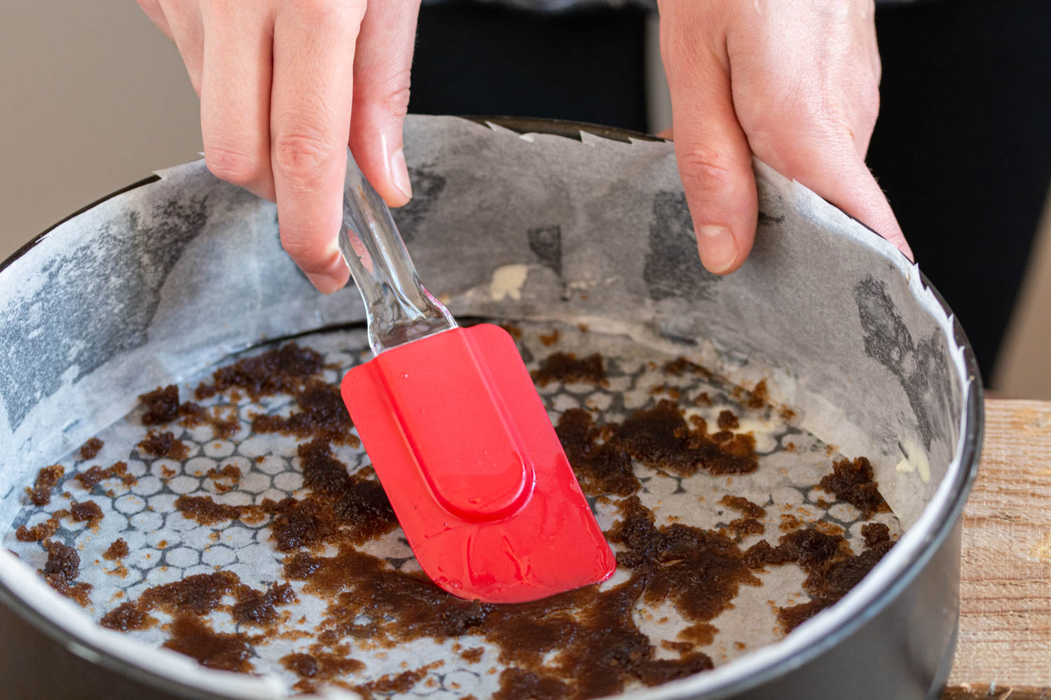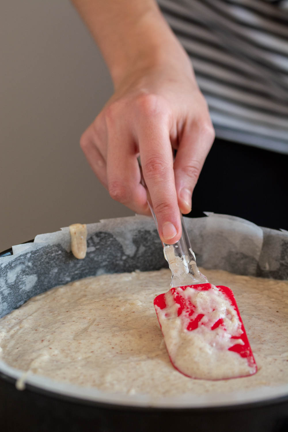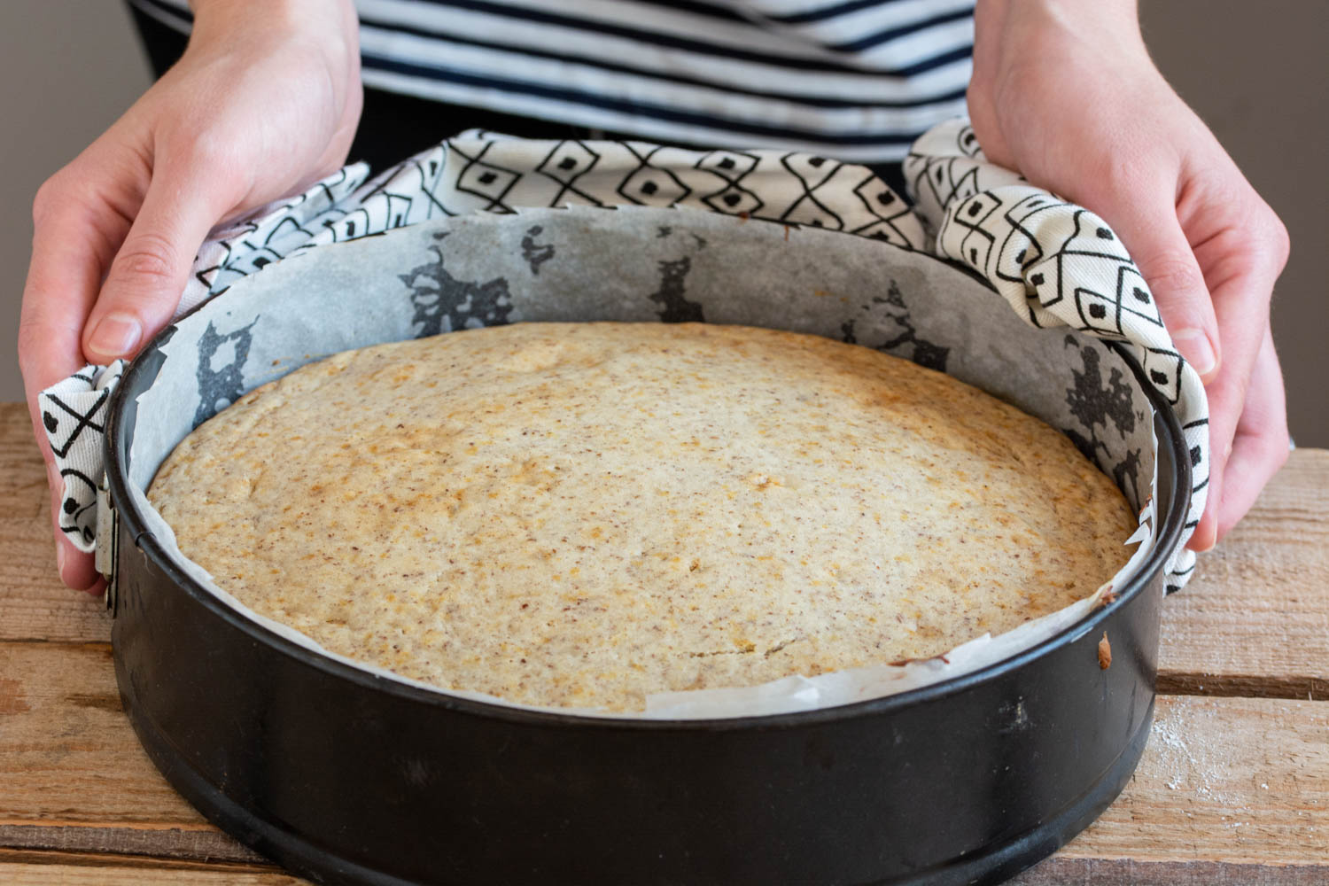 1. Preîncălzirea cuptorului și pregătirea tăvii. Am preîncălzit cuptorul la 200°C / 400° F (treapta 6). Am luat o tavă (cu diametrul de 26cm) cu fund detașabil, am uns-o cu ulei de cocos și am tapetat-o cu hârtie de copt (am folosit ulei pentru ca hârtia să se lipească de tavă).