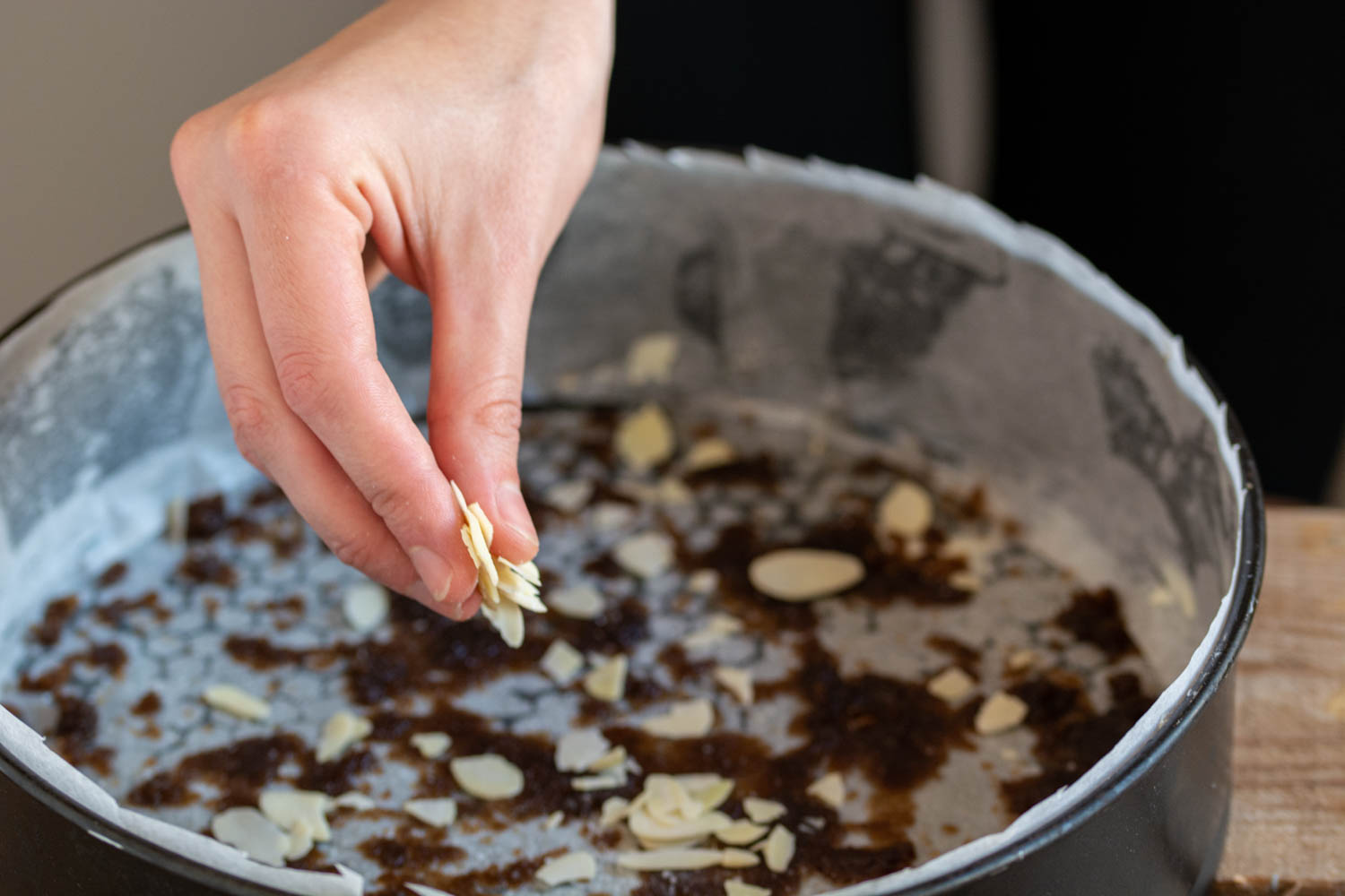 7. Coacere. Am turnat amestecul în tavă și l-am copt timp de 10 minute în cuptorul preîncălzit. După 10 minute am scăzut temperatura la 180°C / 350° F (treapta 4) și am mai copt blatul pentru 30 – 35 de minute (până când a trecut testul scobitorii).