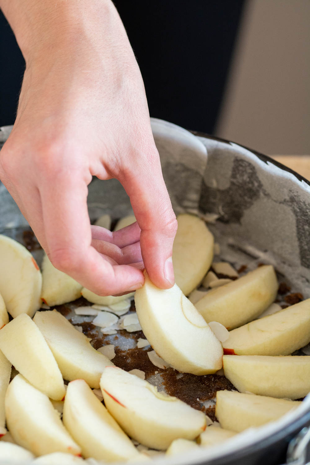 3. Așezarea merelor. Am luat tava tapetată cu hârtie, am adăugat uleiul de cocos topit și zahărul brun și am omogenizat amestecul ajutorul unei spatule. Am adăugat un vârf de cuțit de sare și am răsfirat fulgii de migdale în ploaie. Am așezat merele deasupra fulgilor de migdale în cercuri concentrice.