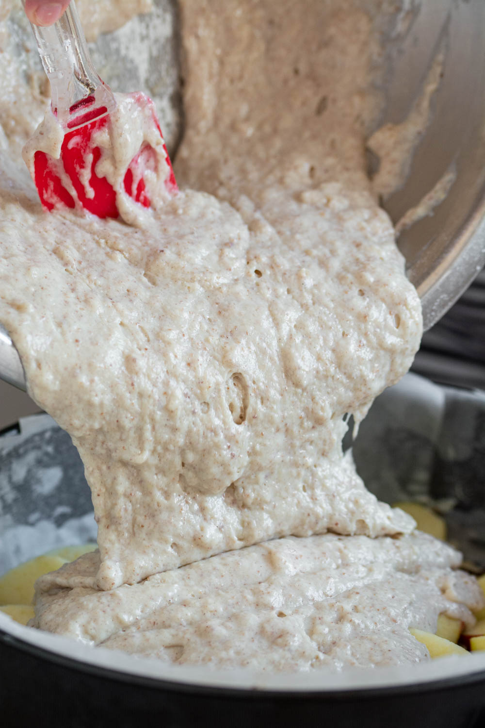 6. Aluatul. Am adăugat ingredientele umede peste cele uscate și am amestecat cu spatula până la omogenizare, fară să exagerez.
