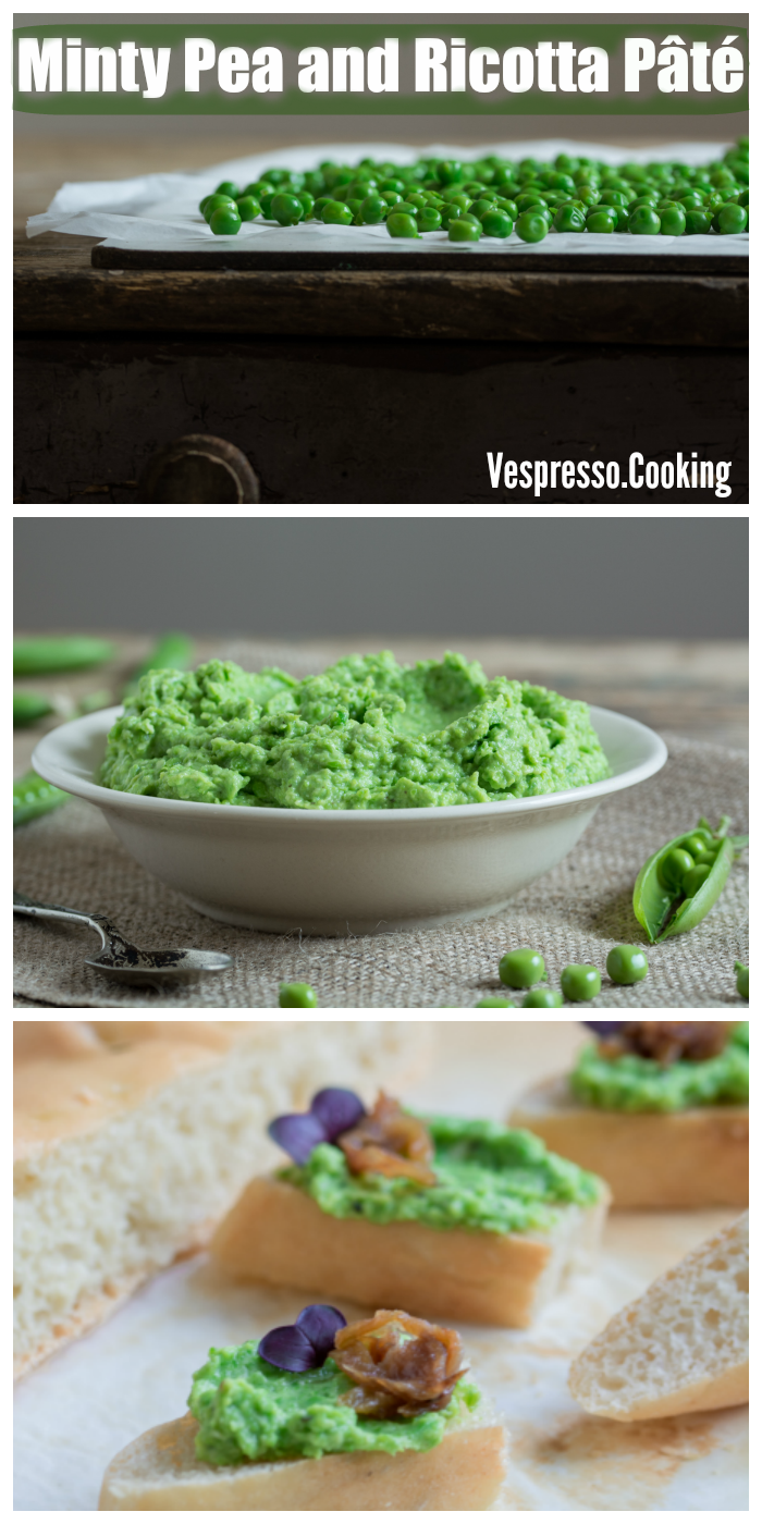 Pea pâté made from frozen peas is a delicious appetizer but when made from fresh spring peas it’s absolutely exquisite. Spring peas are blanched and then mixed with ricotta, parmesan, spring onion and fresh mint and it miraculously transforms into a dense and flavorful cream, with an almost surreal green color. Almost.