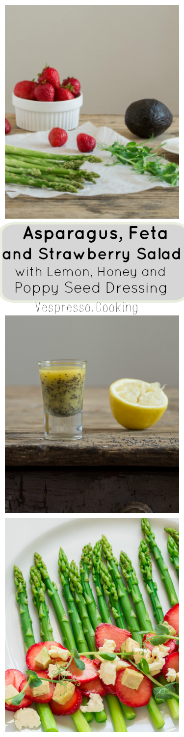 For this particular salad I sliced a few strawberries and I placed them on top of some blanched asparagus. I added pea sprouts, avocado and feta cheese and I dressed them with a fresh and flavorful poppy seed-lemon dressing. Very simple and so delicious!