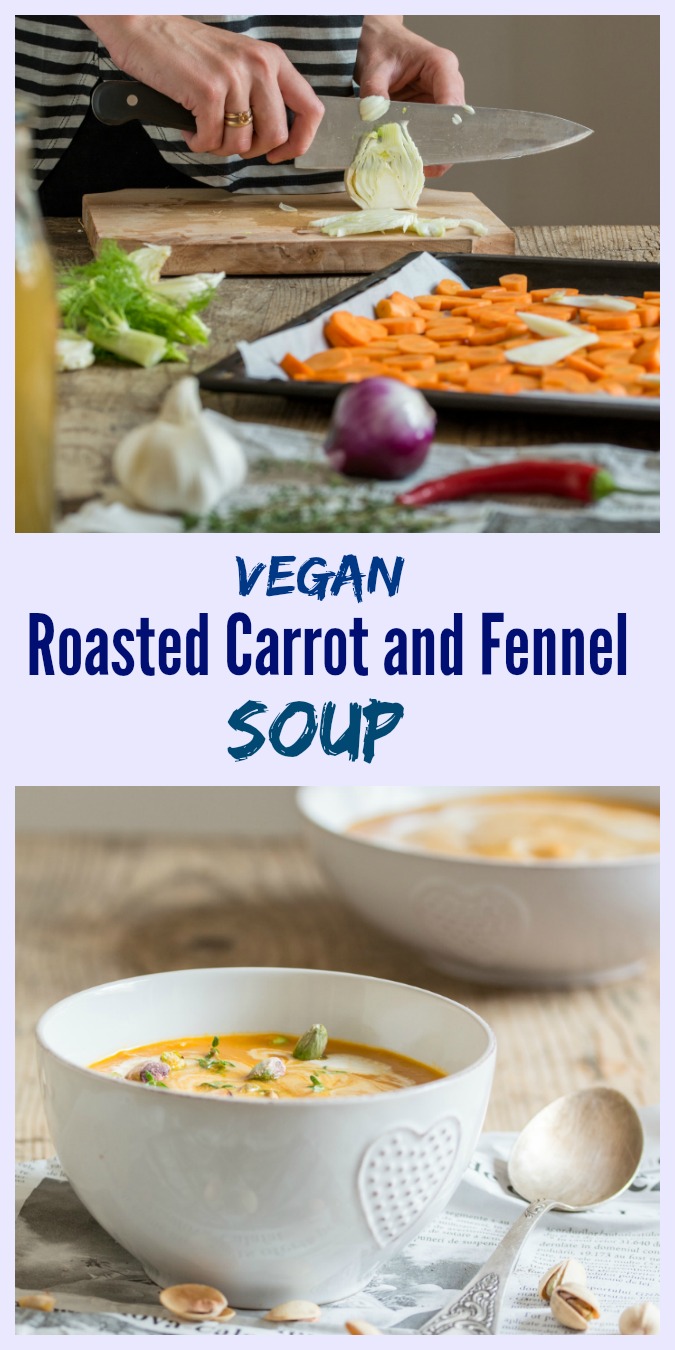 I’ve finally found a recipe for cream of carrot soup that doesn’t taste like baby food. It is made from roasted carrots and fennel, two vegetables that go so well together. I must confess that I picked my carrots from my garden this morning, on a warm summer rain. It sounds enchanting, doesn’t it? So, I chopped the vegetables, I drizzled some olive oil and I roasted them in the oven, just to enhance their flavor. After they were nice and brown, I simmered them in vegetable soup, with red onion, wine and thyme. At the end I flavored the soup with some fragrant roasted garlic. The result was a delicious and hearty soup. The funny thing is that only long after I enjoyed this divine soup I realized that it was in fact vegan. My family never suspected!