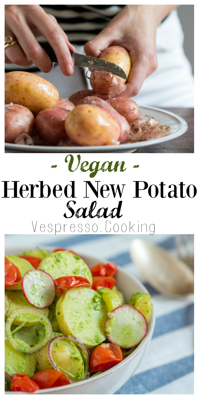 I’m a new potato lover and I’ve always been. I love them boiled, steamed, fried, roasted, it doesn’t matter how are they cooked, as long as I can still perceive that lovely nutty flavor. It’s not spring until I make a new potato salad and I prepare it at least once a week. Who am I kidding, I make it every other day! My all time favorite new potato salad is unbelievably flavorful, very satisfying and (funny enough) vegan. In this recipe I used new potatoes, which I’ve picked from my own garden and I boiled them in vegetable broth (you can only imagine the flavor on these guys). I mixed them with radishes, onion rings and roasted tomatoes and I dressed them with a fresh herb, olive oil and vegetable broth emulsion. Let’s get serious, what’s not to like?