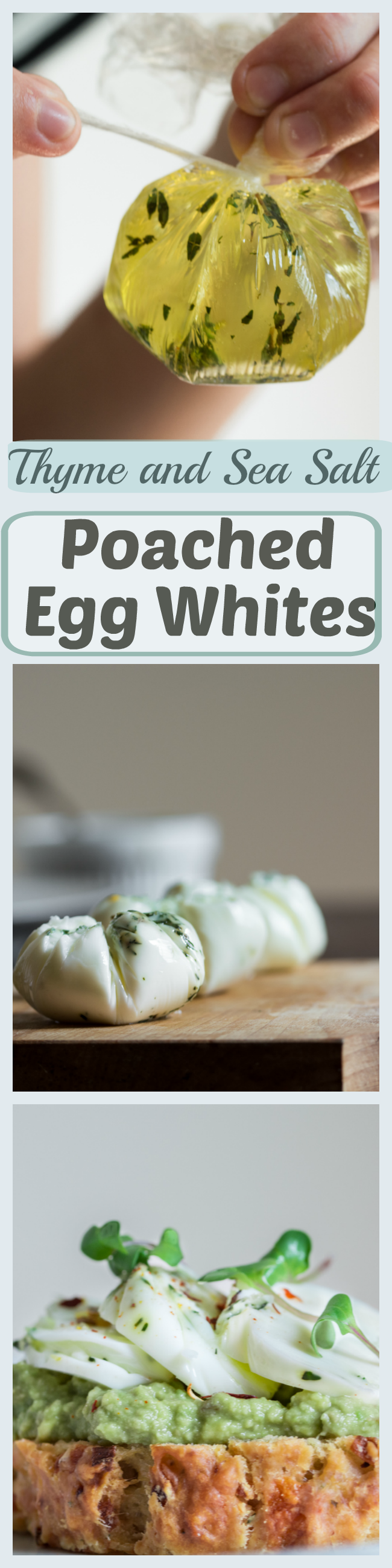 Whenever I engage myself in over-ambitious bakery projects, I end up by throwing away the egg whites. Of course I plan on using them the following days, but I almost never do. And I strongly dislike wasting and throwing things away. Lately, to avoid any waste (and all the bad energy that comes with it), I take 2 egg whites at a time, I wrap them in cling film square, I season them with sea salt, olive oil and fresh herbs and I poach them in hot water. This way, you get some flavorful egg white balls, perfect for a weekend brunch.