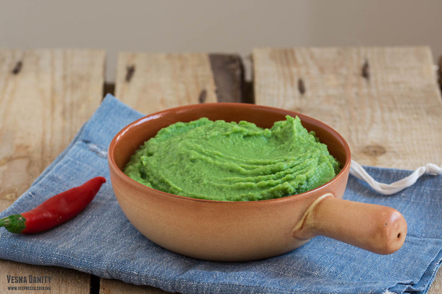 - Add the spices (cumin, chili flakes and salt). Add 1 Tbsp of water and process. Add more water until you reach the desired consistency. Spoon it into a bowl and drizzle some olive oil on top.