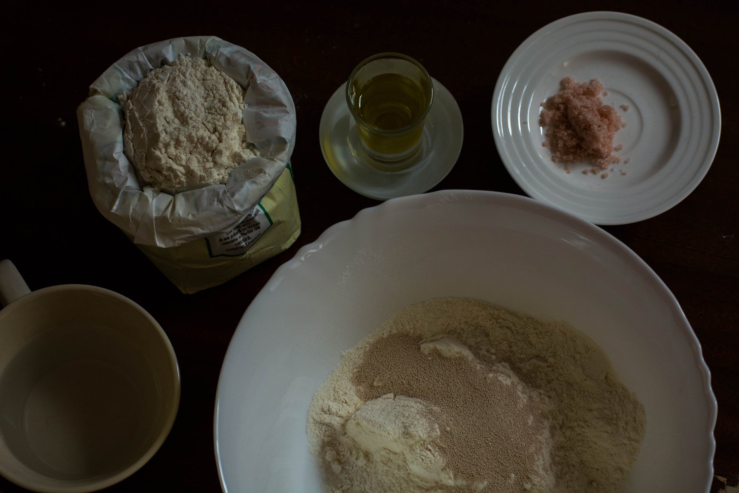 - Se amestecă o cană de făină cu o cană de apă și conținutul unui plic de drojdie. Se lasă amestecul 15 minute (într-un loc cald) pentru a se activa drojdia. După cele 15 minute amestecul ar trebui să crească în volum și să prezinte bule de aer la suprafață.